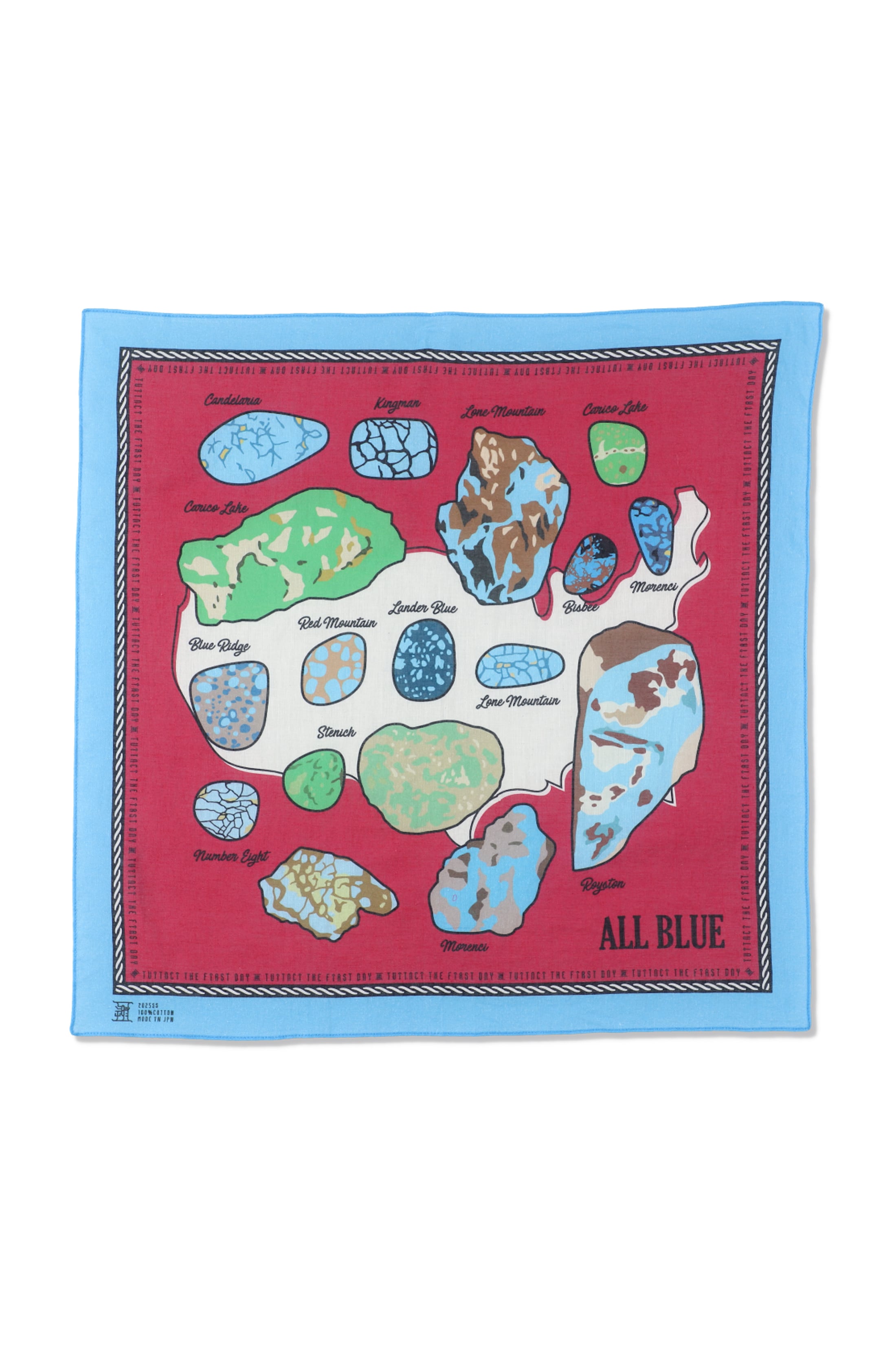 採れる鉱山によって特徴や色味が異なる、ターコイズ。ニューメキシコの広大な空のような「青」は多くの人々を魅了し続ける。アメリカの鉱山で採掘されるターコイズをマップ化した、バンダナ。