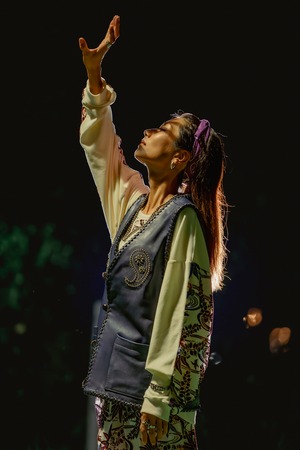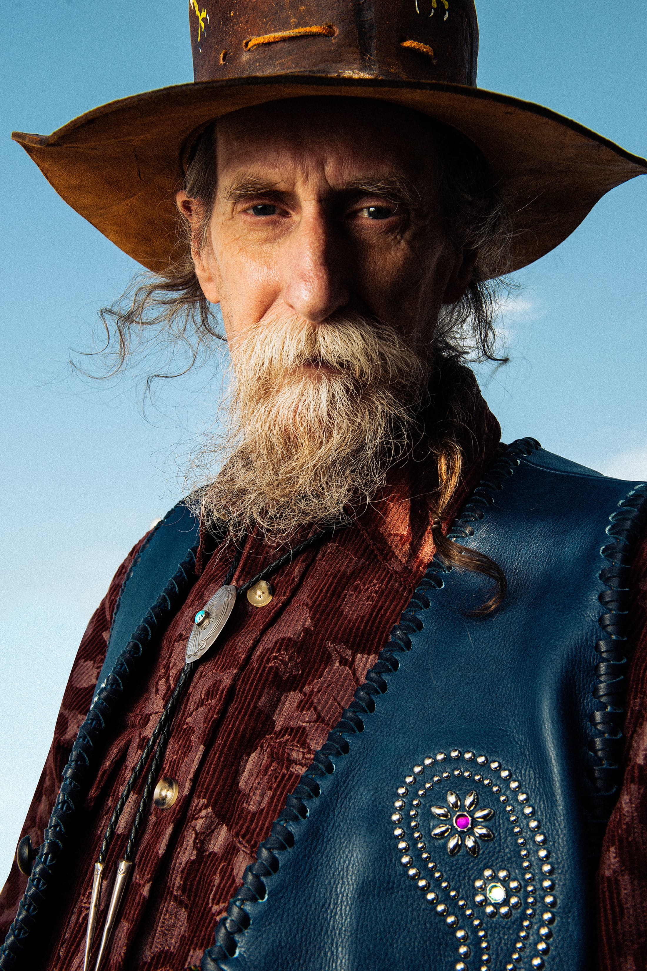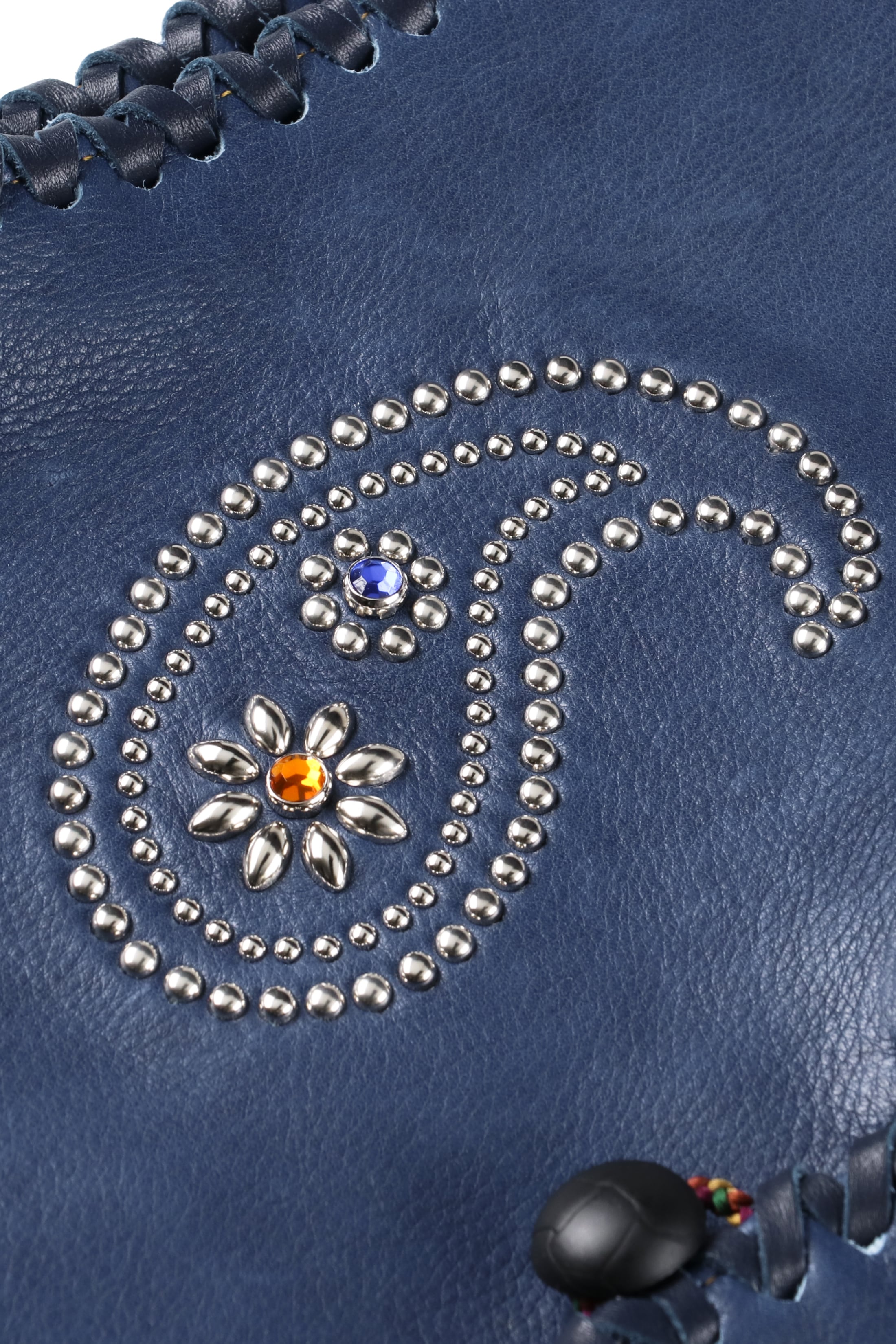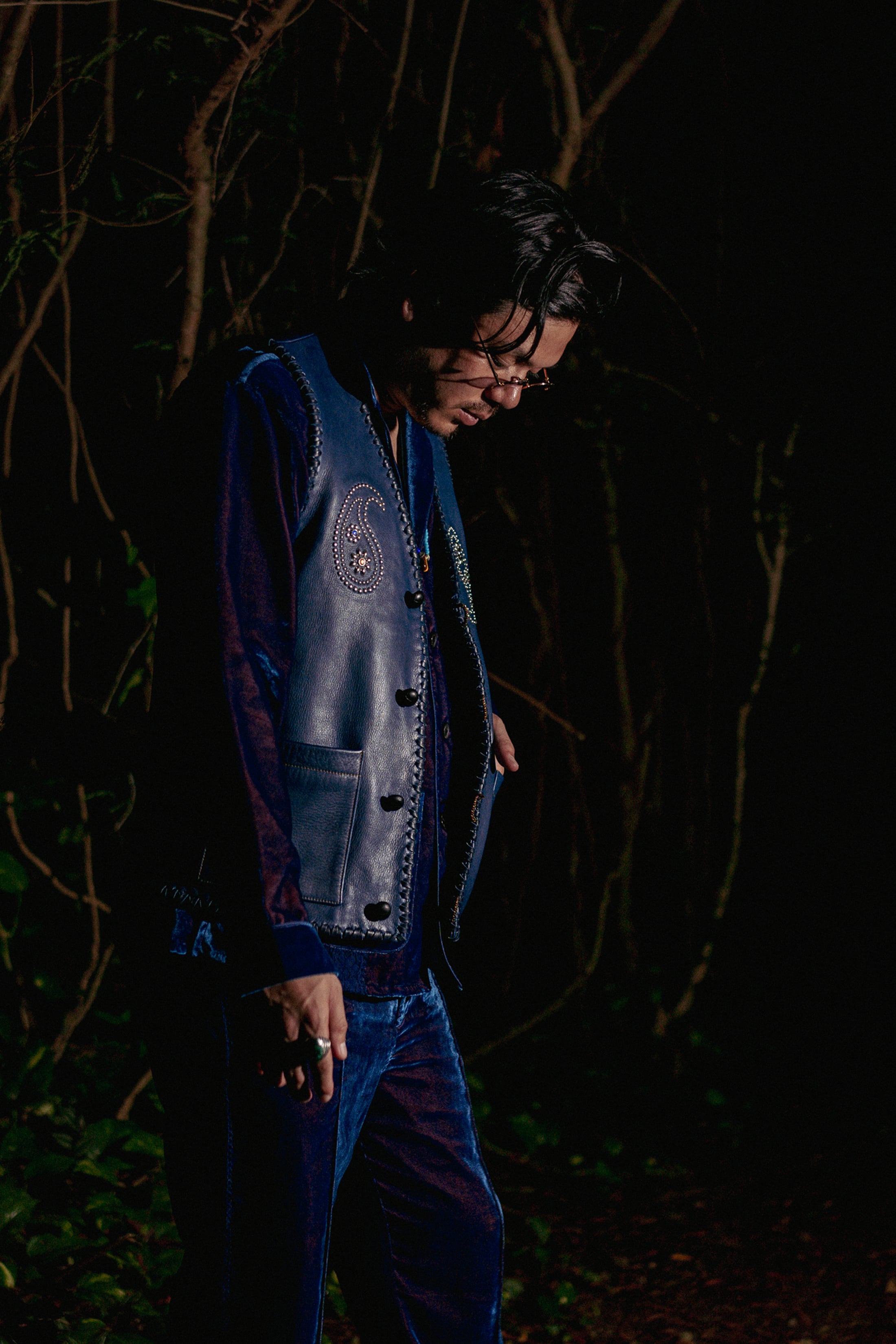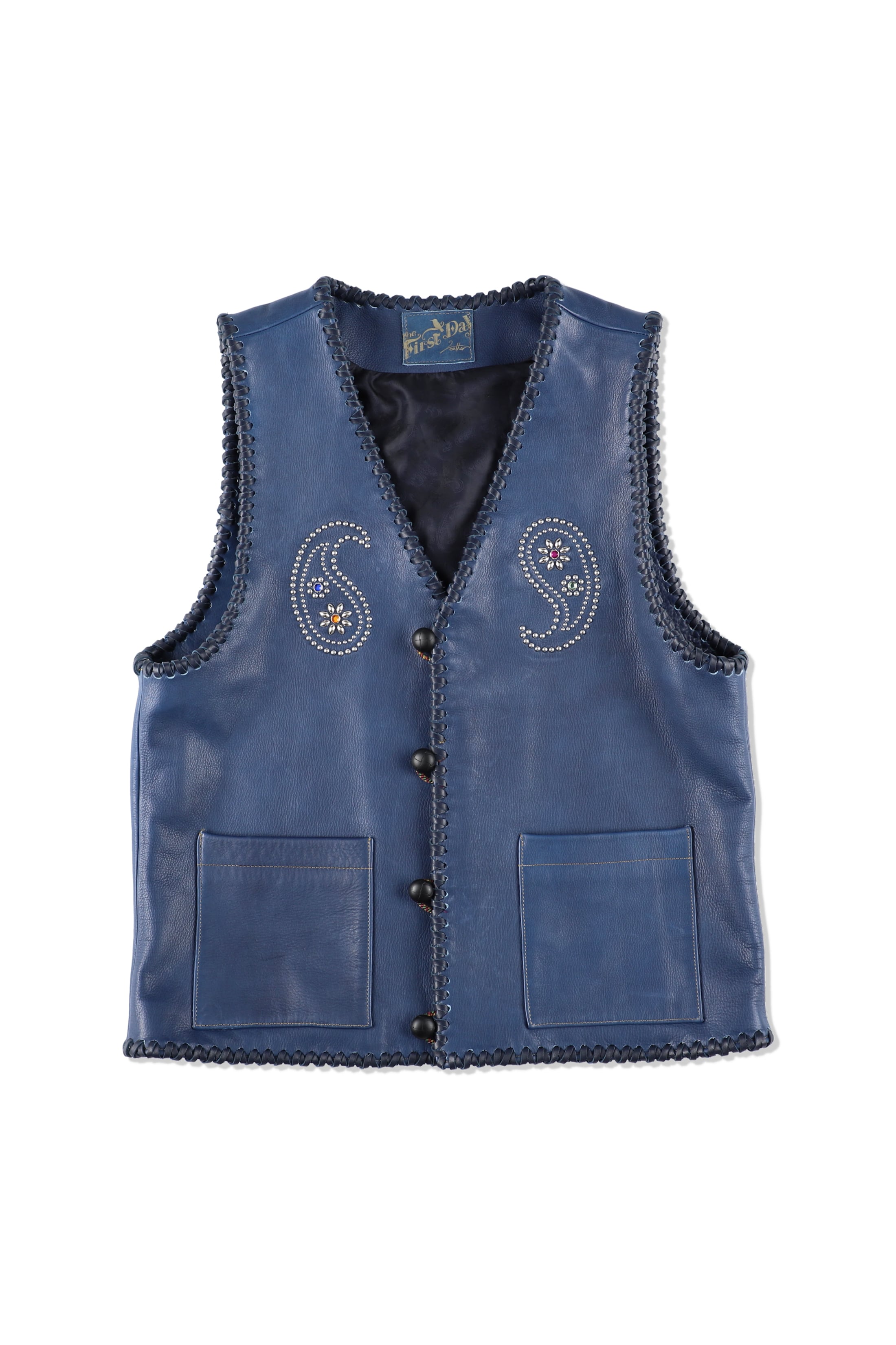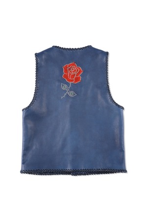 姫路タンナーの上質なガーメントをインディゴ染料で染色、天日干しからのバフ掛けで革本来の艶、質感を最大限演出したインディゴレザー。上質なレザーを使用したベストにスタッズワークを光らせました。スタッズはすべてアメリカンスタッズを使用。背面のバラの花びら部分は職人によるハンドペイント。そして特徴的な随所の編み込みもすべて手作業で装飾しています。レザーくるみ釦の留めには三重県の伝統工芸品、伊賀組紐を使用。美しく染め上げられた絹糸の風合いがアクセントに。インディアンのネイティブベストやバイク乗り達が着るチームベストを思わせる一着。専用のレザータグが付属。