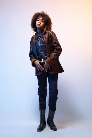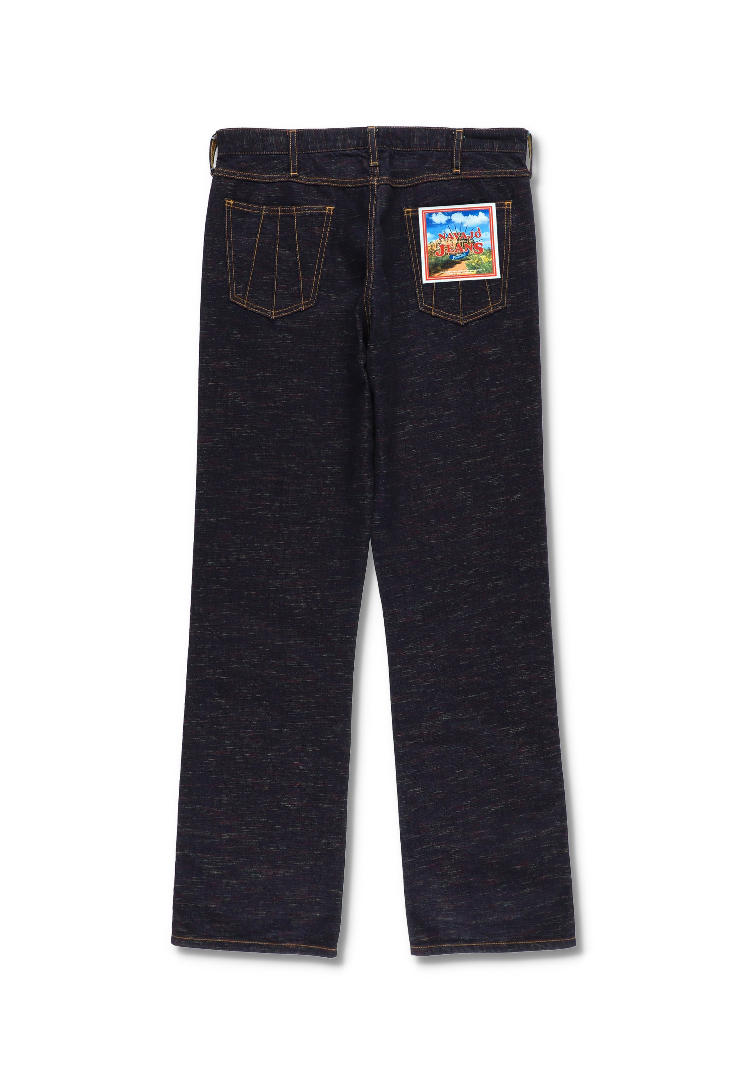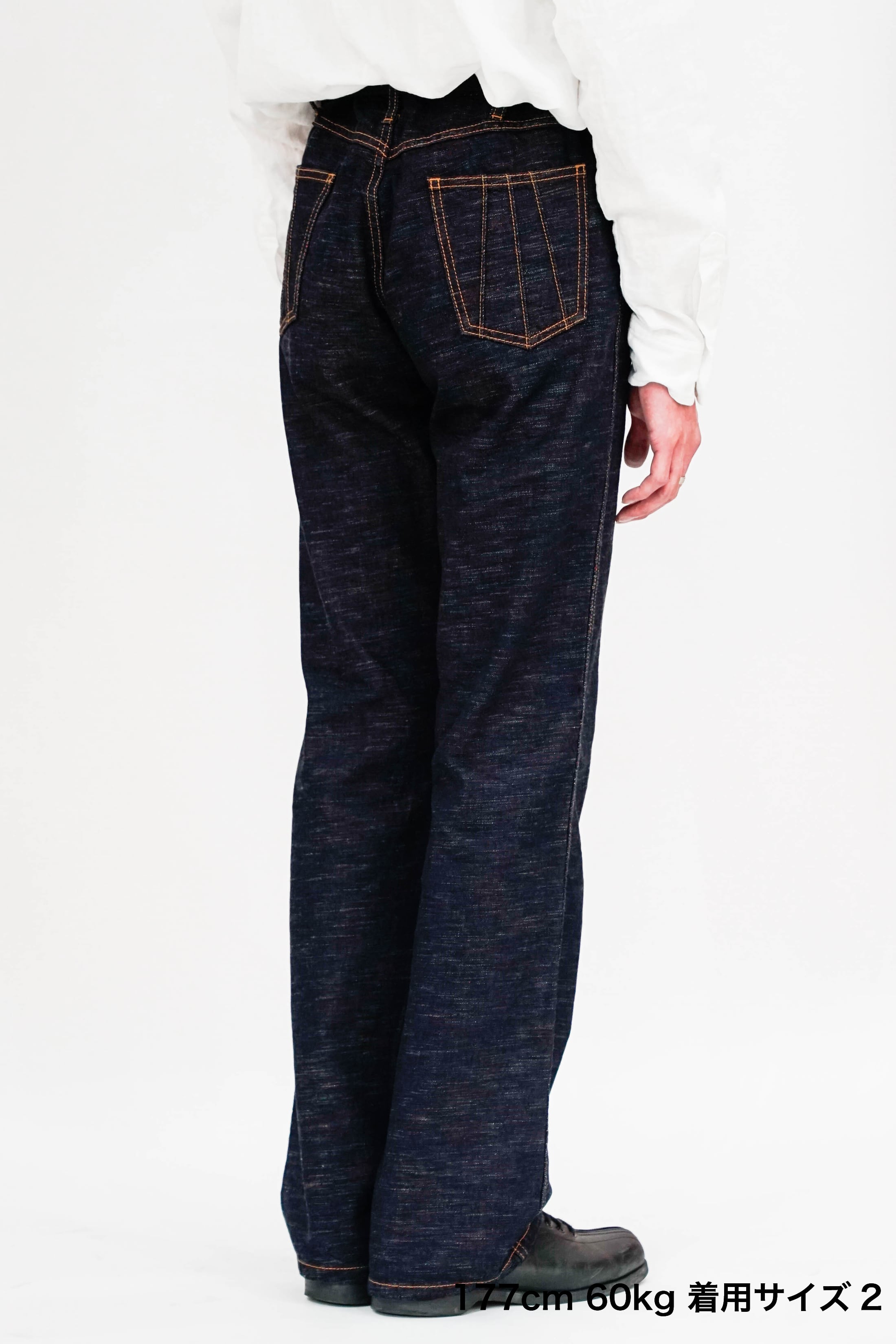 インディアンジュエリーのインレイワーク(はめ込み技法)をイメージし、カラフルなカスリ糸を使用した11.5ozデニムシリーズ。サンバースト(太陽光線)を思わせる随所のピンタック、スタッズワークをイメージしたリベット使いなど、ジュエリーにおけるナバホの技法やデザインをディテールとして採用。生地の製作から縫製まで全行程をデニムの産地岡山にて製造。縦糸にインディゴ、横糸にカスリ糸を使用しており、履き込むごとに色落ち、ムラ感がコントラストとして現れる一本。