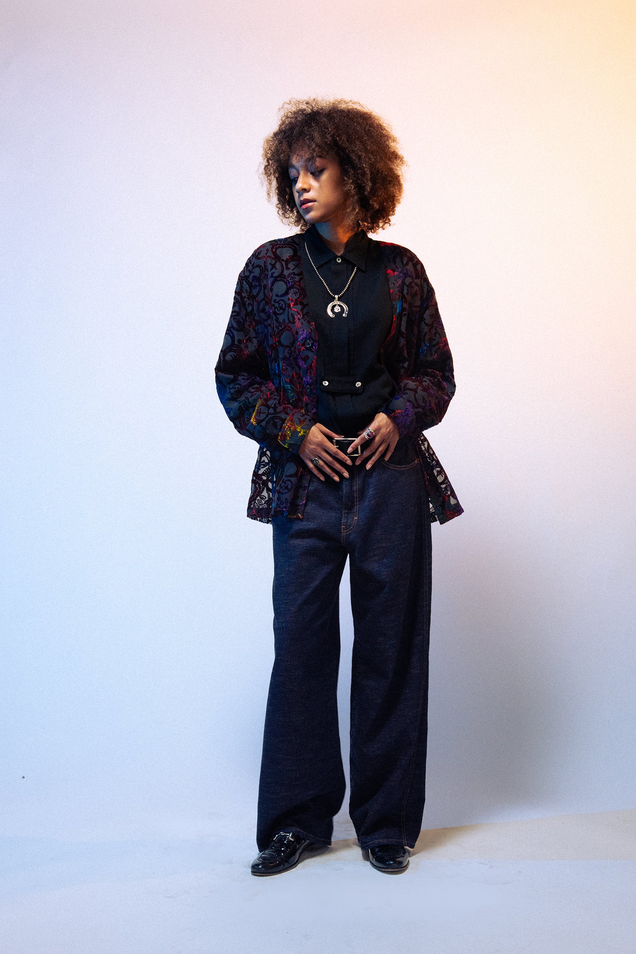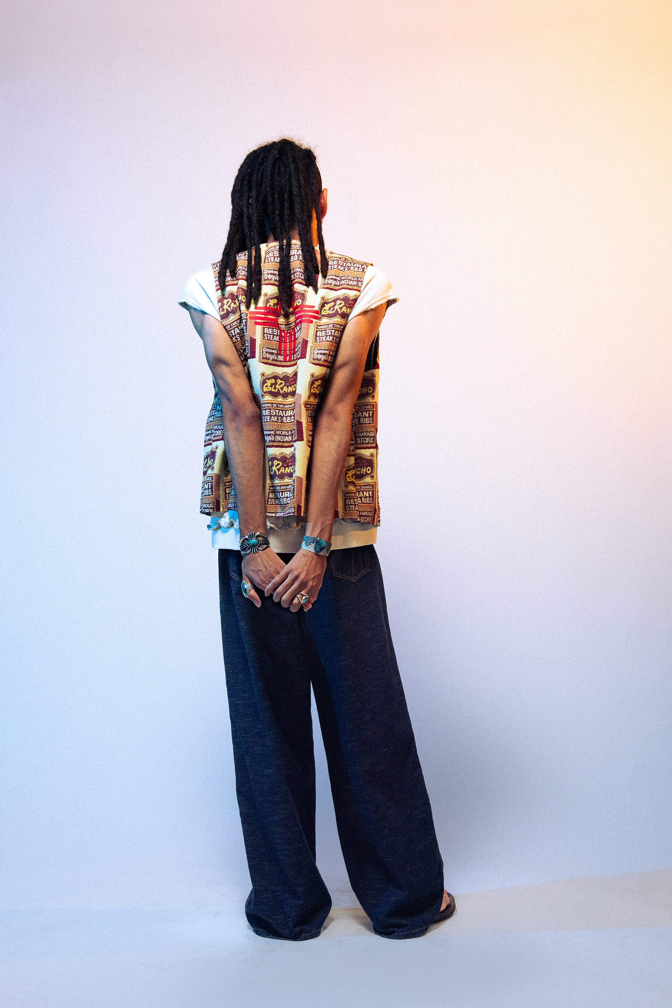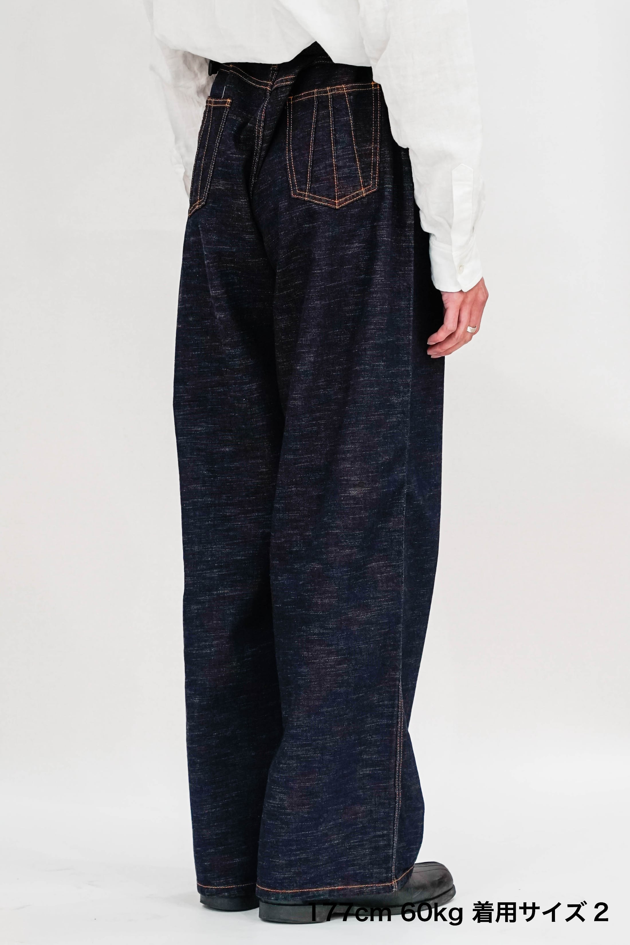 インディアンジュエリーのインレイワーク(はめ込み技法)をイメージし、カラフルなカスリ糸を使用した11.5ozデニムシリーズ。サンバースト(太陽光線)を思わせる随所のピンタック、スタッズワークをイメージしたリベット使いなど、ジュエリーにおけるナバホの技法やデザインをディテールとして採用。生地の製作から縫製まで全行程をデニムの産地岡山にて製造。縦糸にインディゴ、横糸にカスリ糸を使用しており、履き込むごとに色落ち、ムラ感がコントラストとして現れる一本。