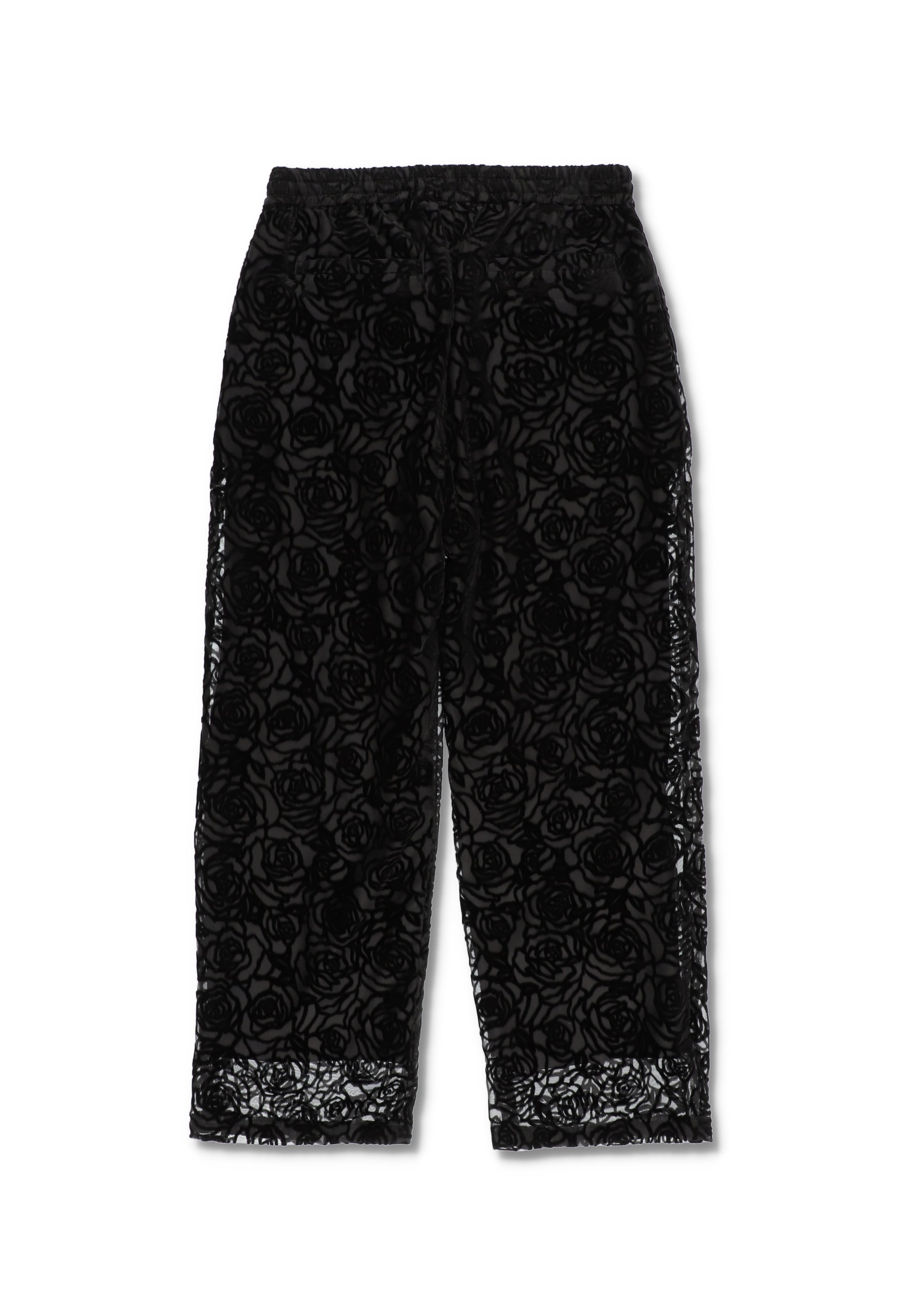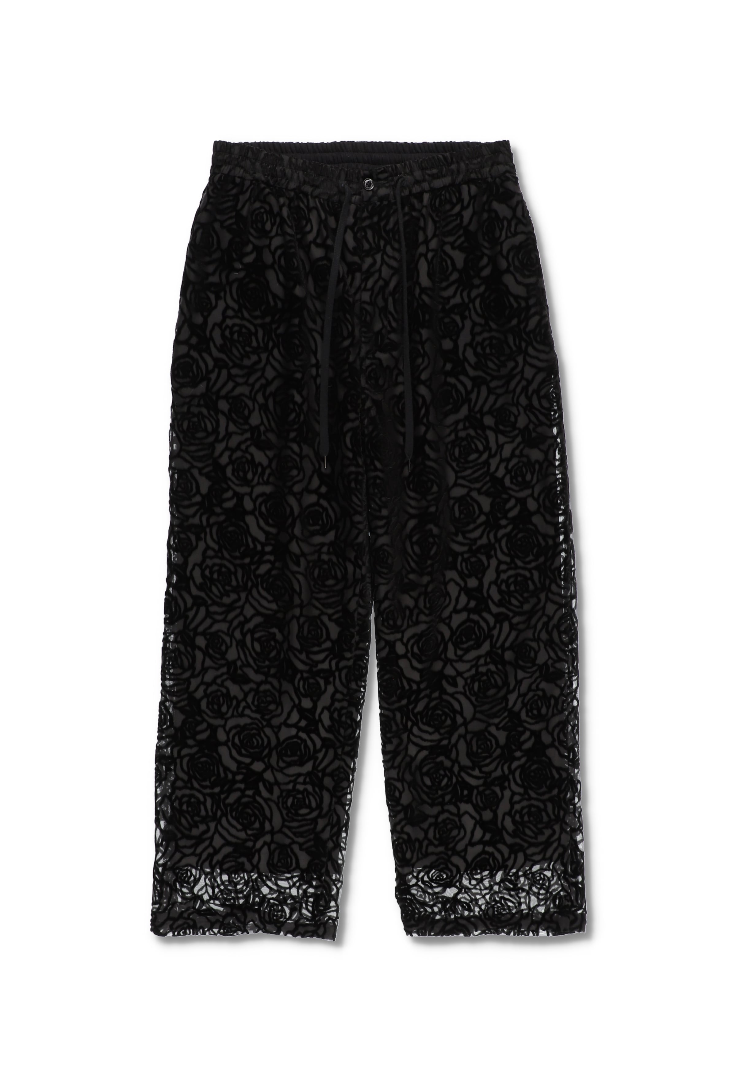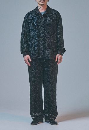 光沢の美しいレーヨンベルベットにオパール加工を施し、生地を溶かして無数のバラ柄を表現。