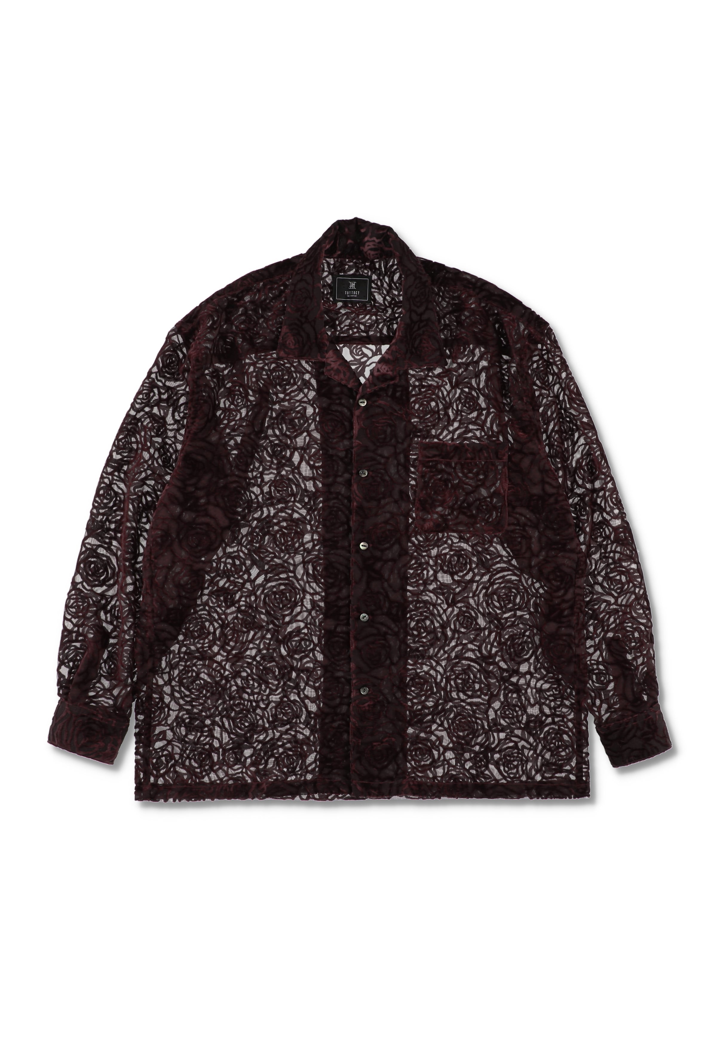 光沢の美しいレーヨンベルベットにオパール加工を施し、生地を溶かして無数のバラ柄を表現。裏地を付けず、生地の特徴である透け感とドレープを際立たせた長袖シャツ。速乾性に優れ、シワにならない。イージーケアで扱いやすい一着。