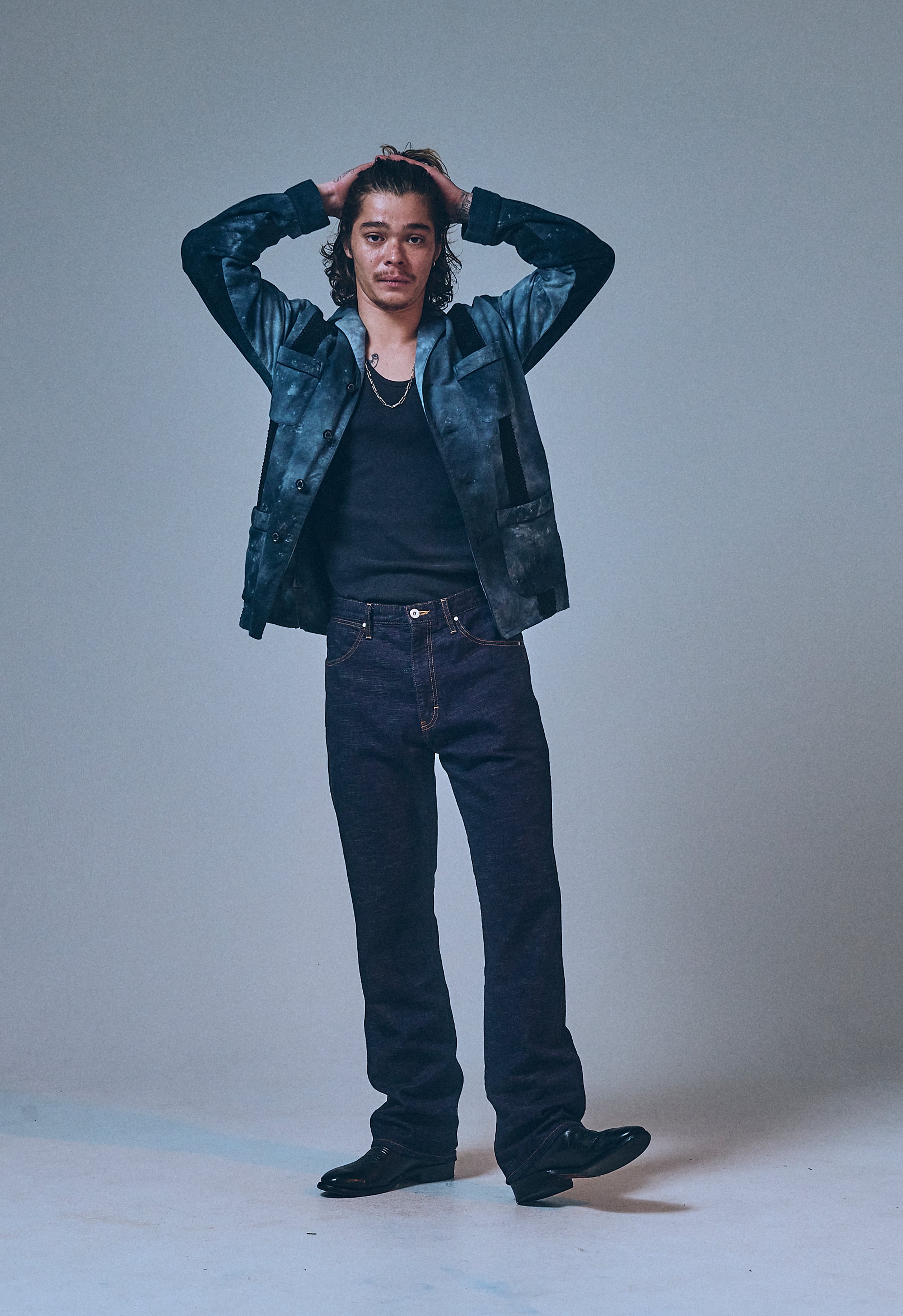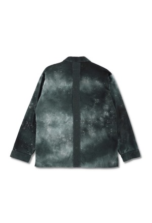 随所のパイピング、丸みを帯びた襟など、スリーピングシャツをベースにキューバシャツのエッセンスをミックス。キューバシャツに多く見られる、ピンタックや刺繍表現ではなく、デザインレースを配置。ムラ染めを施した、両面起毛のフランネル。