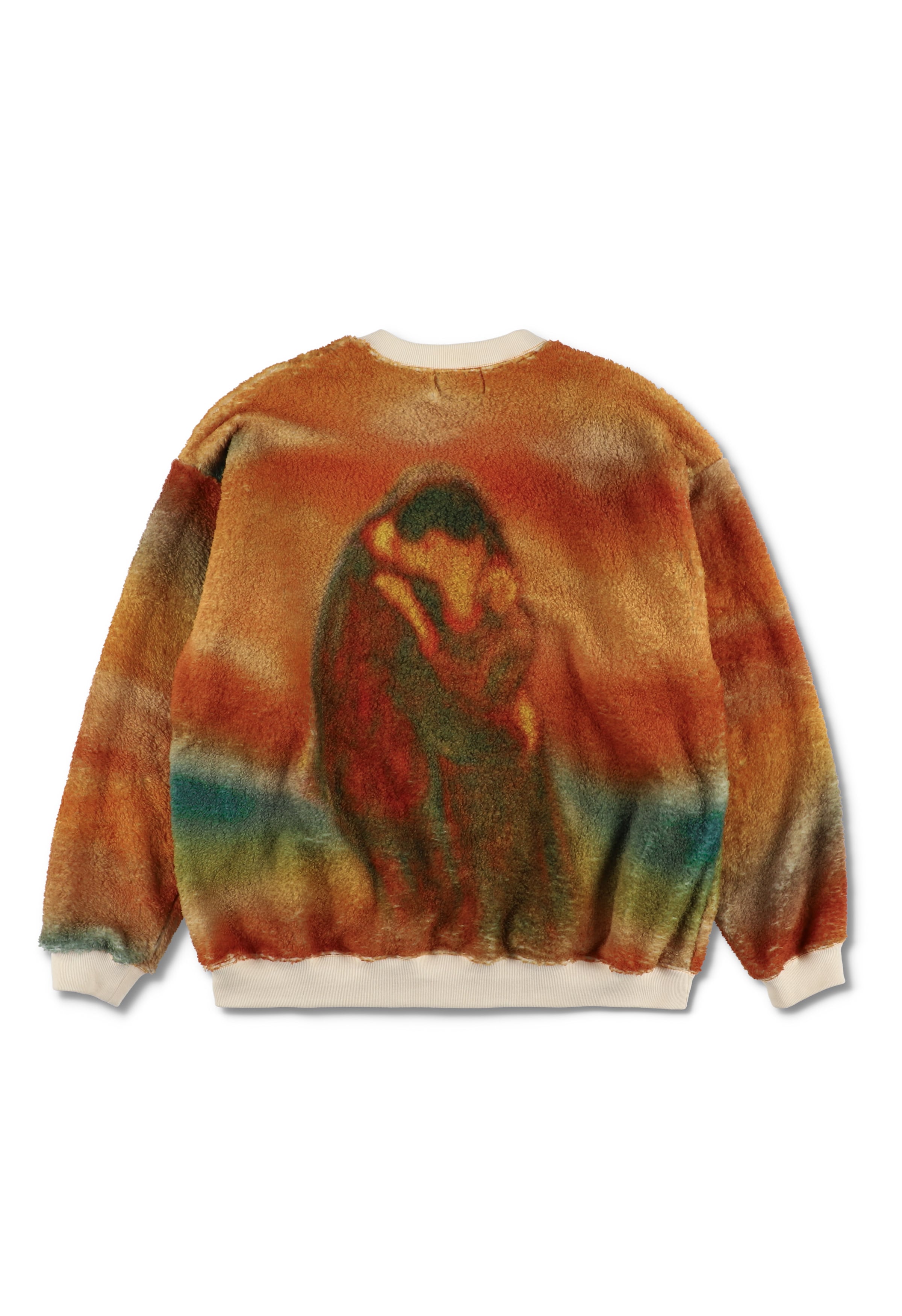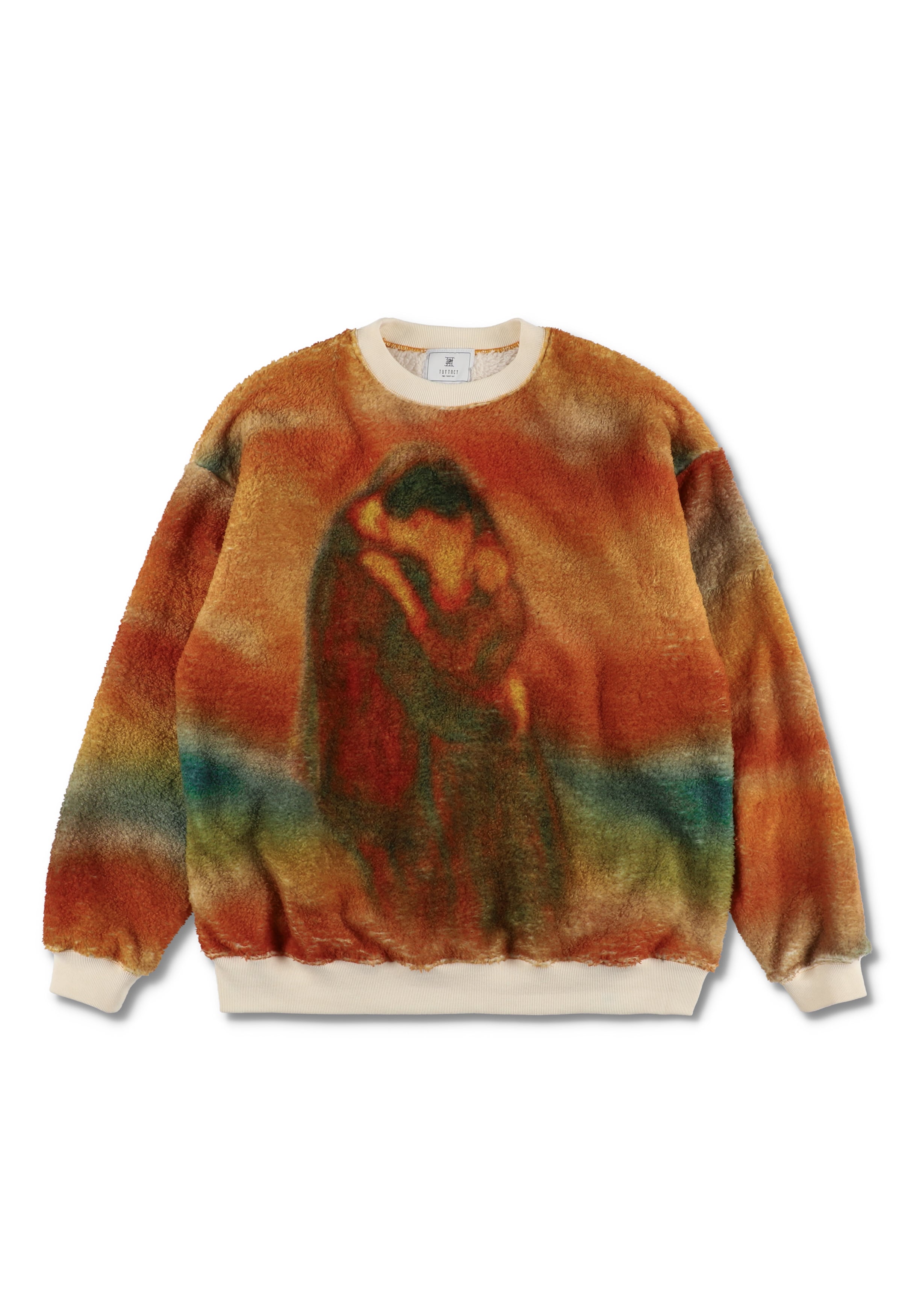 両面起毛を施した軽量で保温性の高いボアフリースに転写プリントで柄を表現。寄り添い口づけを交わす男女を「TWILIGHT」と「NIGHT」のシュチュエーションに配置。温かい空気を外に逃さずミドルレイヤーとして重宝するプルオーバー。