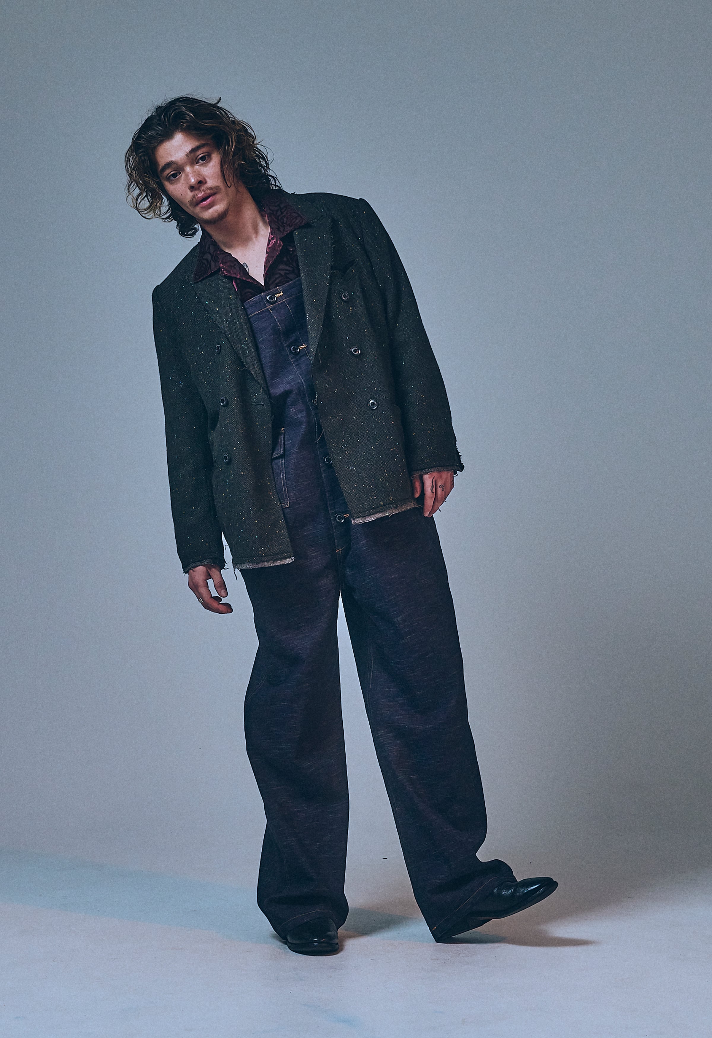 インディアンジュエリーのインレイワーク(はめ込み技法)をイメージし、カラフルなカスリ糸を使用した11.5ozデニムシリーズ。大きめのパッチポケットや釦フライの前開きなど、独自のディテールを多く搭載したオーバーオール。バスト〜ヒップ周りにはゆとりを持たせ、裾に向けてテーパードしていく、バルーンシルエット。