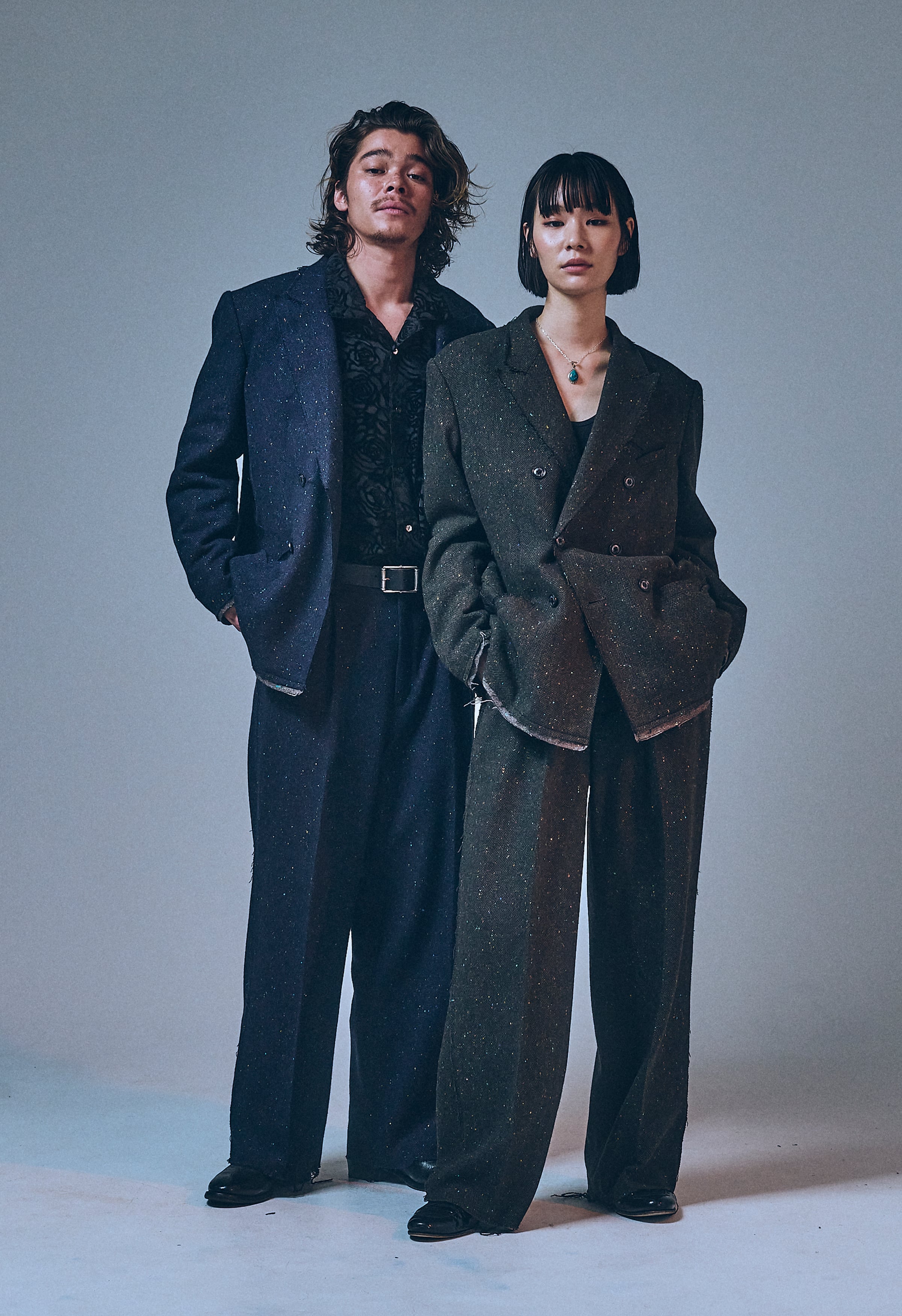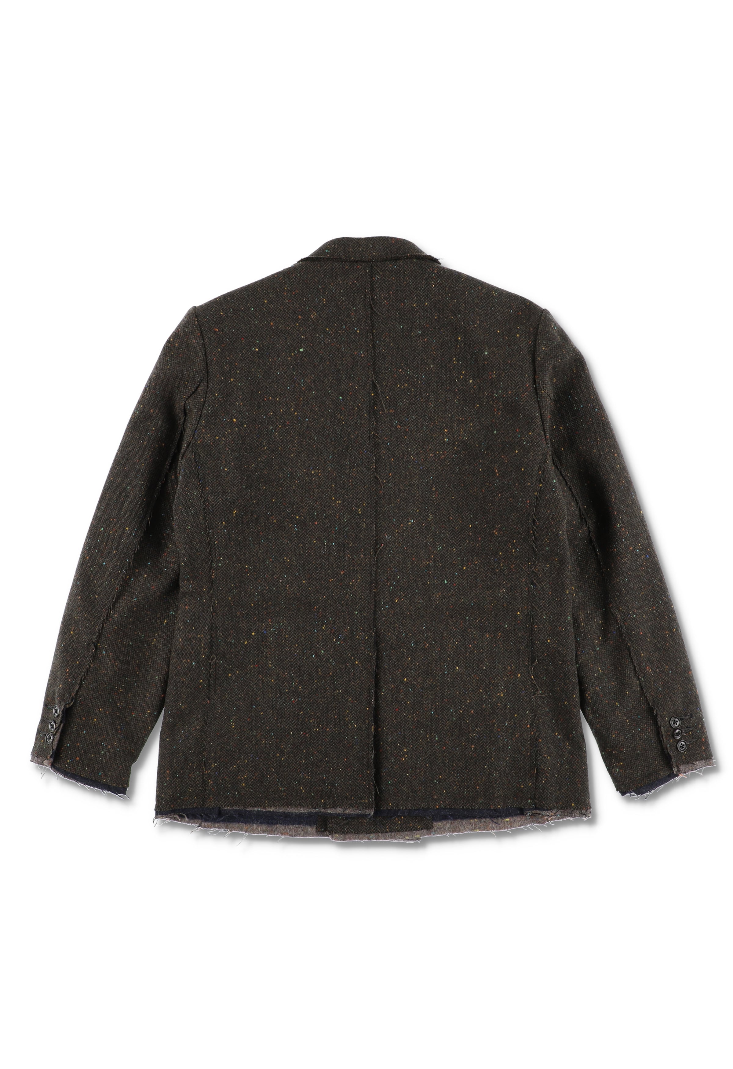 カラーネップを含んだ、柔らかく落ち感のあるツイードジャケット。ピークドラペル、肩パッドで形成されたショルダーライン、ダブル仕様。クラシックな印象ながら、随所を断ち切りで仕上げ、裏地にはウールブランケットを採用している。