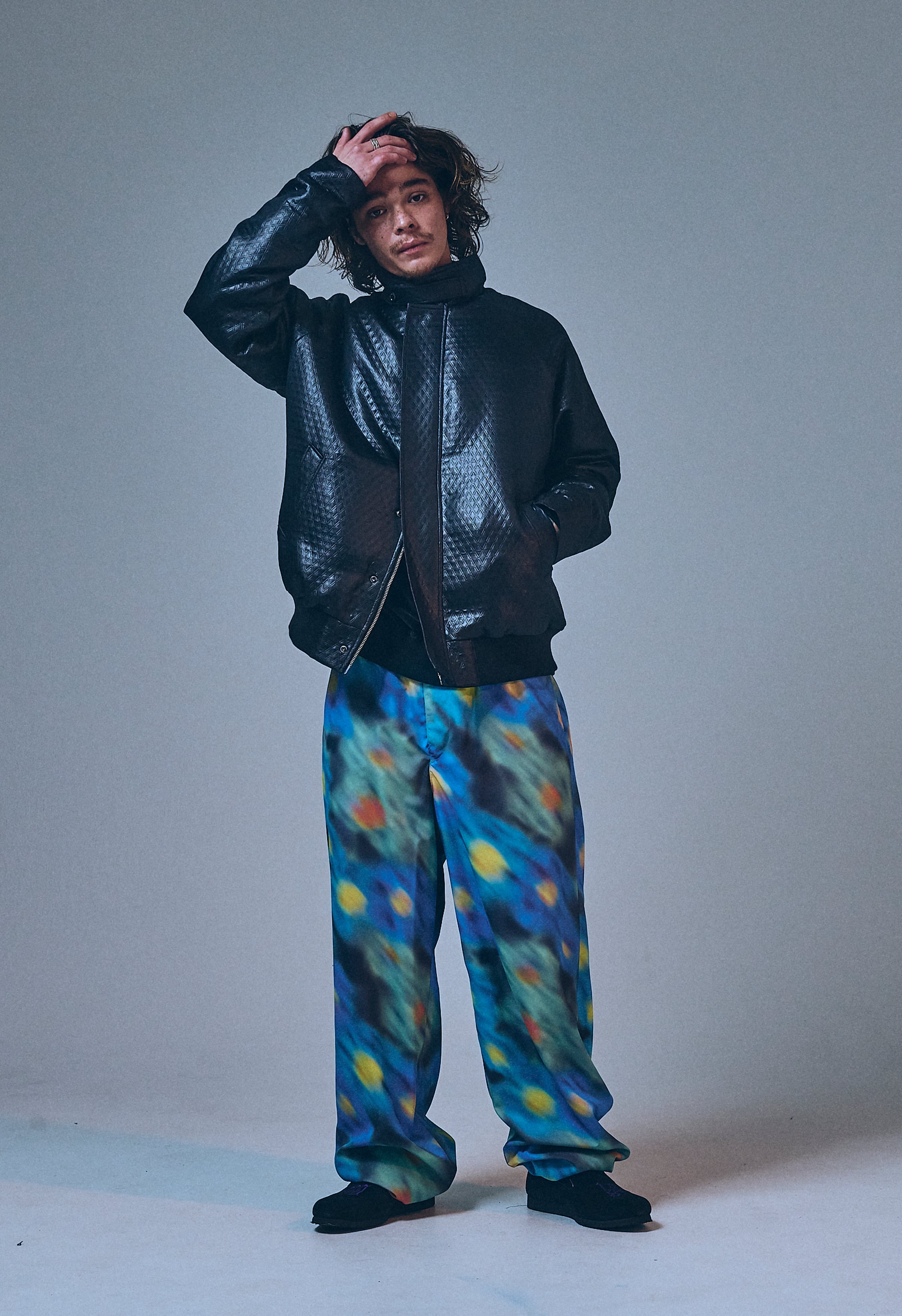 フィクショナルフラワー「ICIRIA」をぼかし表現で転写プリントしたオリジナルタフタ。打ち込みの多い高密度タフタに撥水加工を施し、機能性も高めたアクティブウェア。肌触りの良いドライなメッシュ裏地が付属。