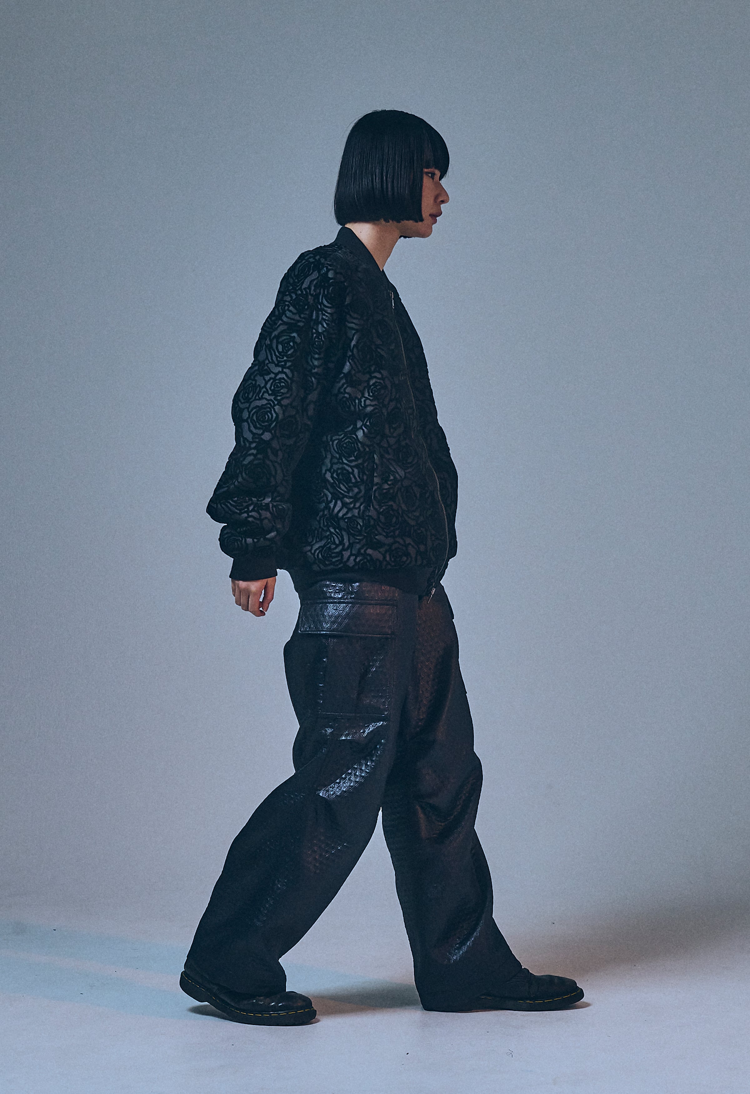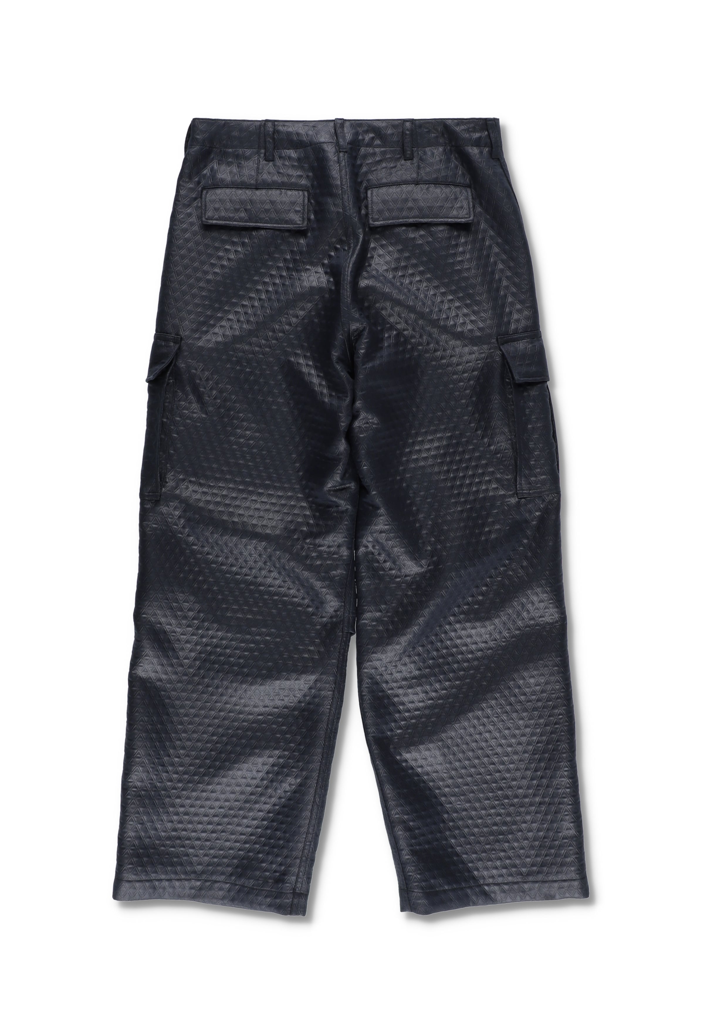 キルティング調に織り上げたジャガード生地にカレンダー加工を加え、レザーのような光沢を表現。膝のタックやカーゴポケットなど、立体感のあるディテールを多く取り入れたカーゴパンツ。
