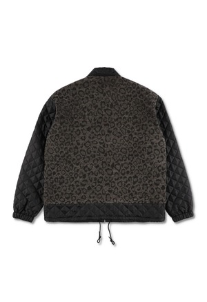 シワ加工を施したシャンブレーツイルを中綿、裏地とキルティングした3層のオリジナルファブリック。50年代をイメージした、レオパード生地との組み合わせが特徴的なジップジャケット。