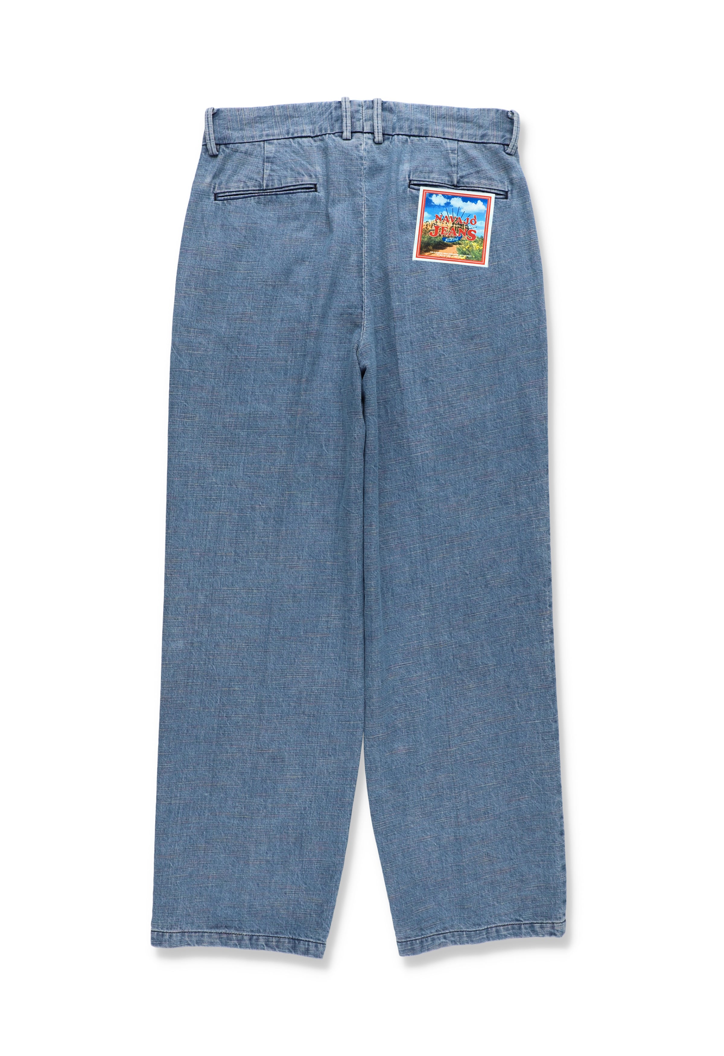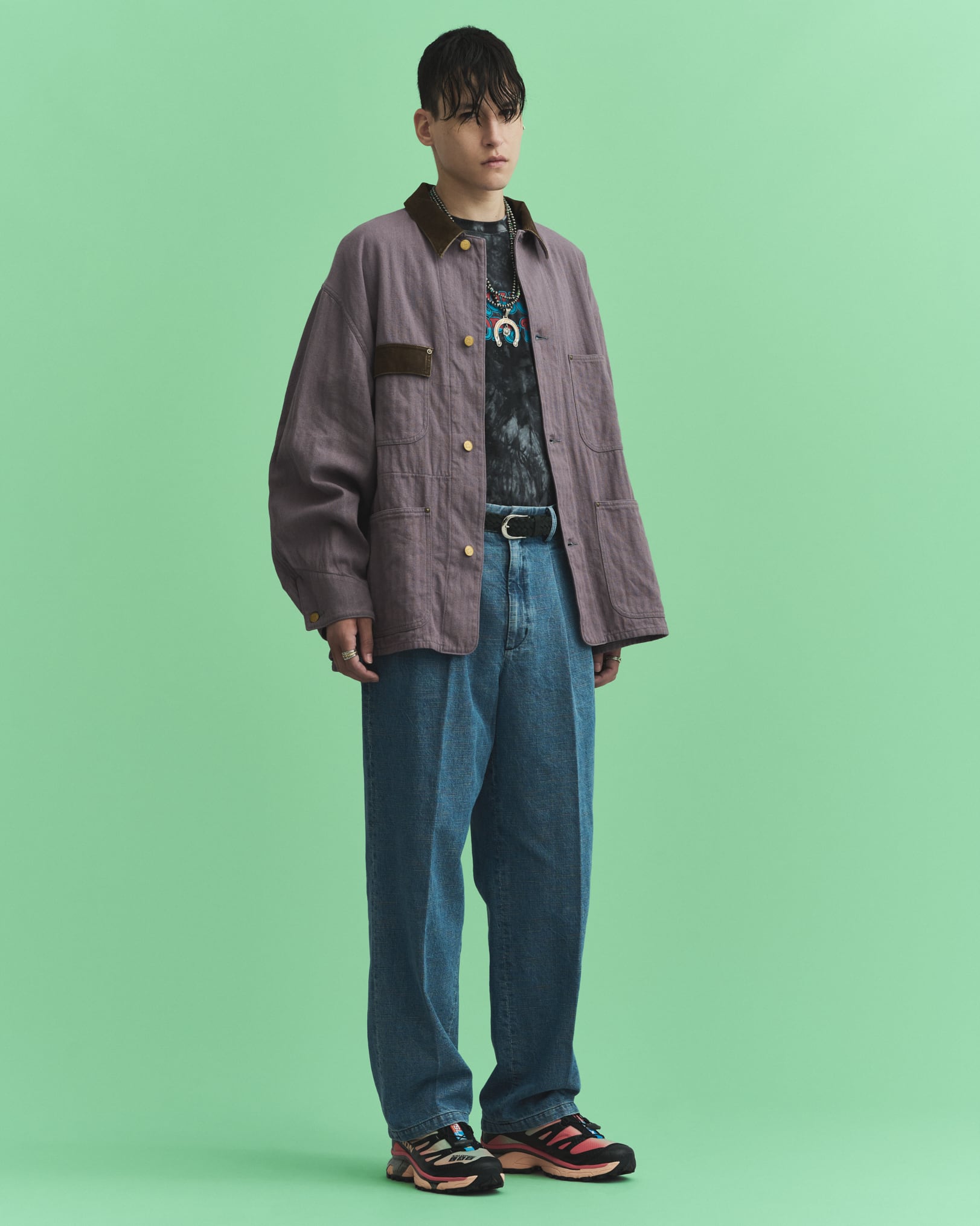インディアンジュエリーのインレイワーク(はめ込み技法)をイメージし、カラフルなカスリ糸を使用した11.5ozオリジナルデニムシリーズ。生地の製作から縫製まで全行程をデニムの産地岡山にて製造。縦糸にインディゴ、横糸にカスリ糸を使用しており、履き込むごとに色落ち、ムラ感がコントラストとして現れる。