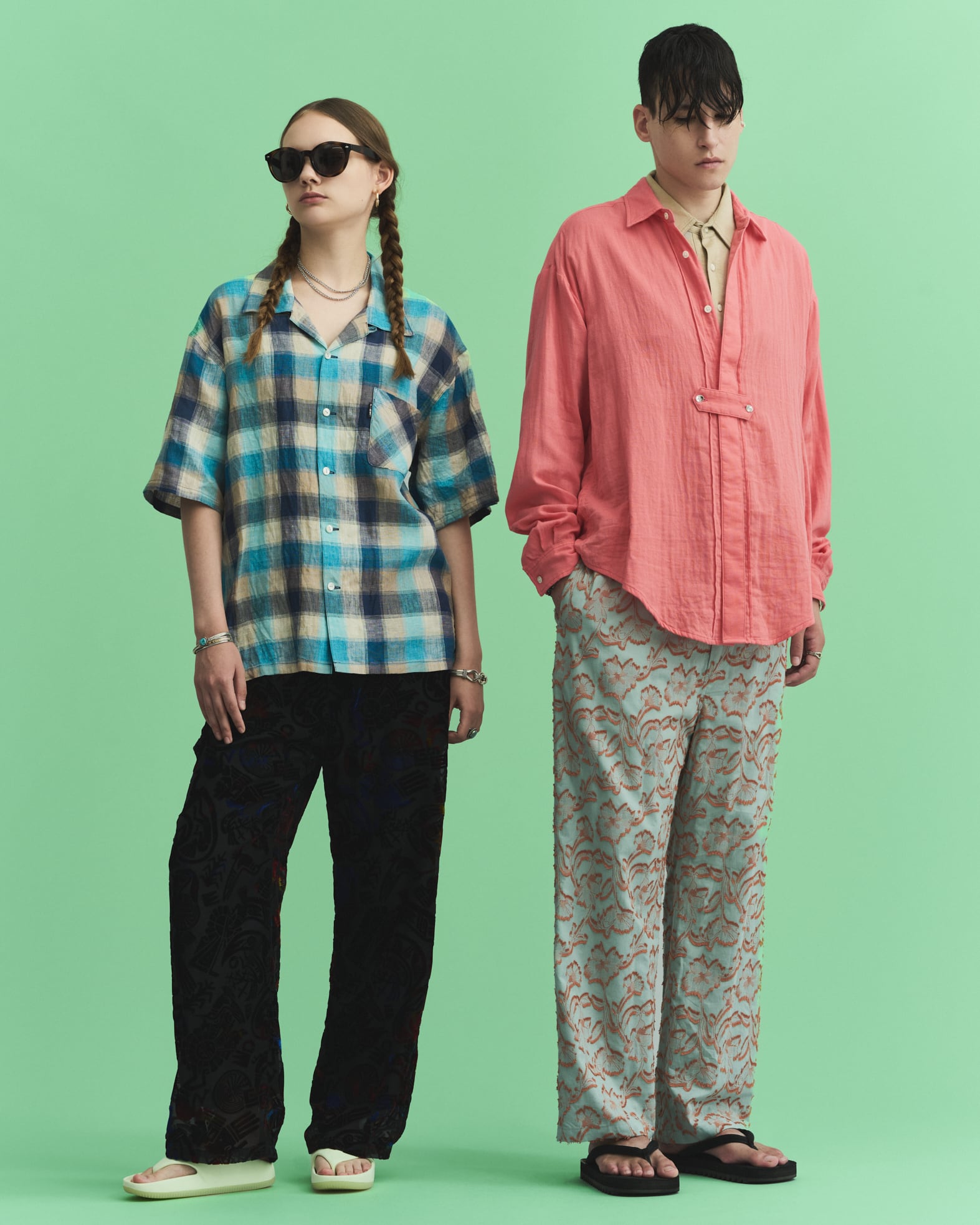 ダブルガーゼの柔らかな風合いが特徴の比翼シャツ。インディアンジュエリーをイメージした、シルバー925製の釦を付属。ミニマルなデザインの中に美しい輝きがアクセント。