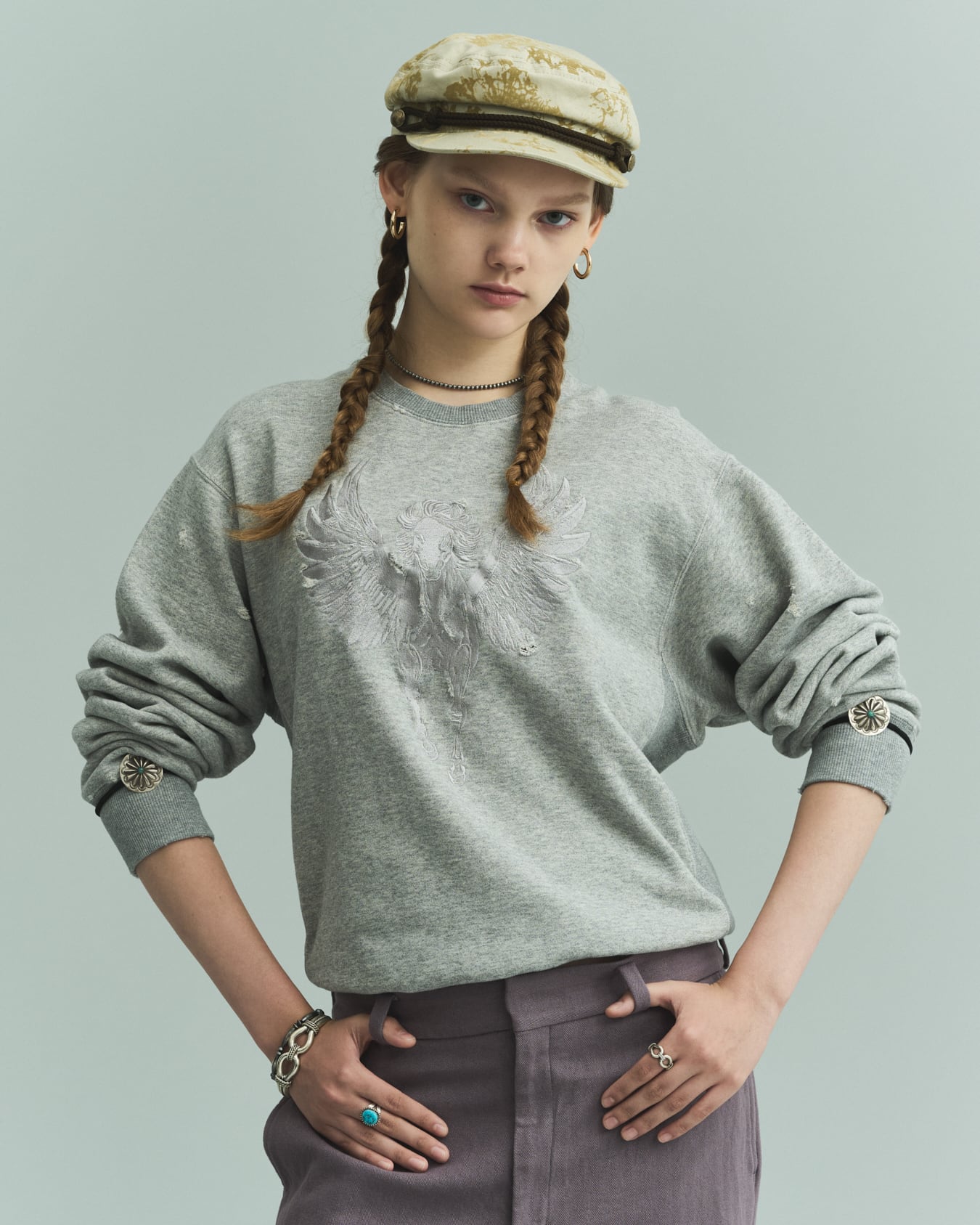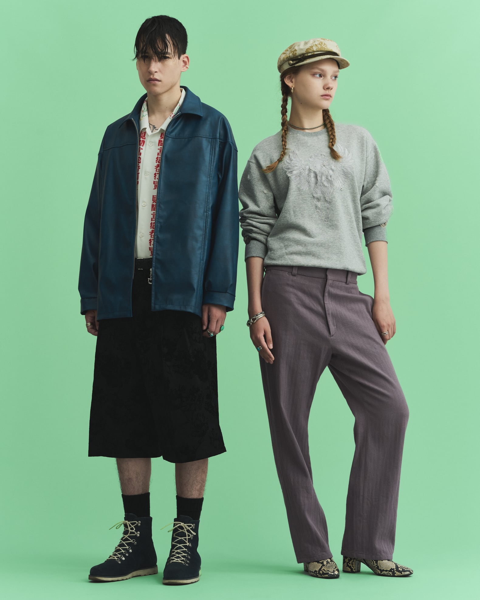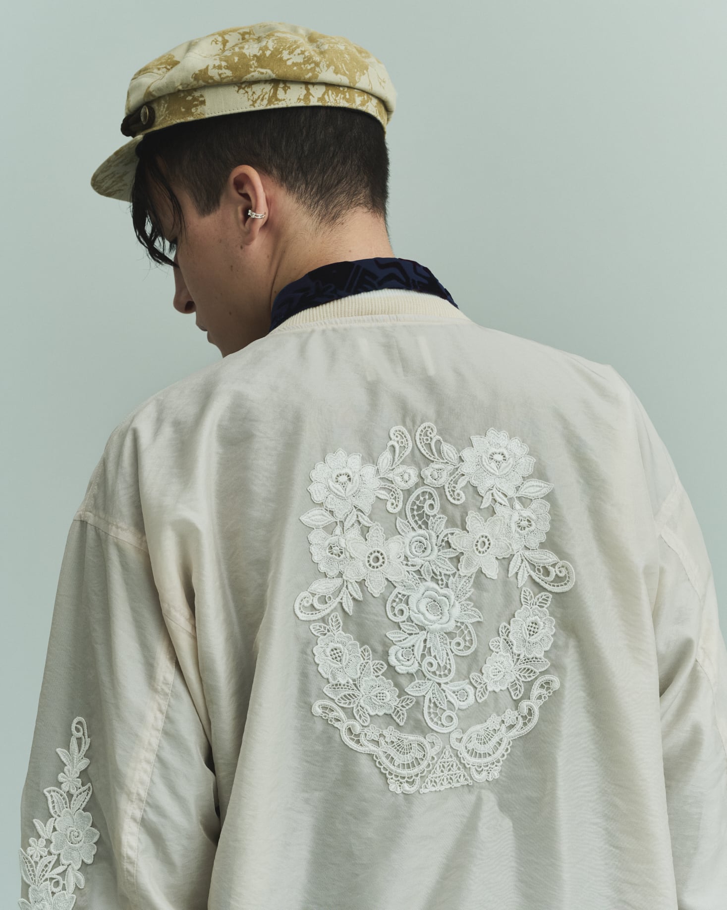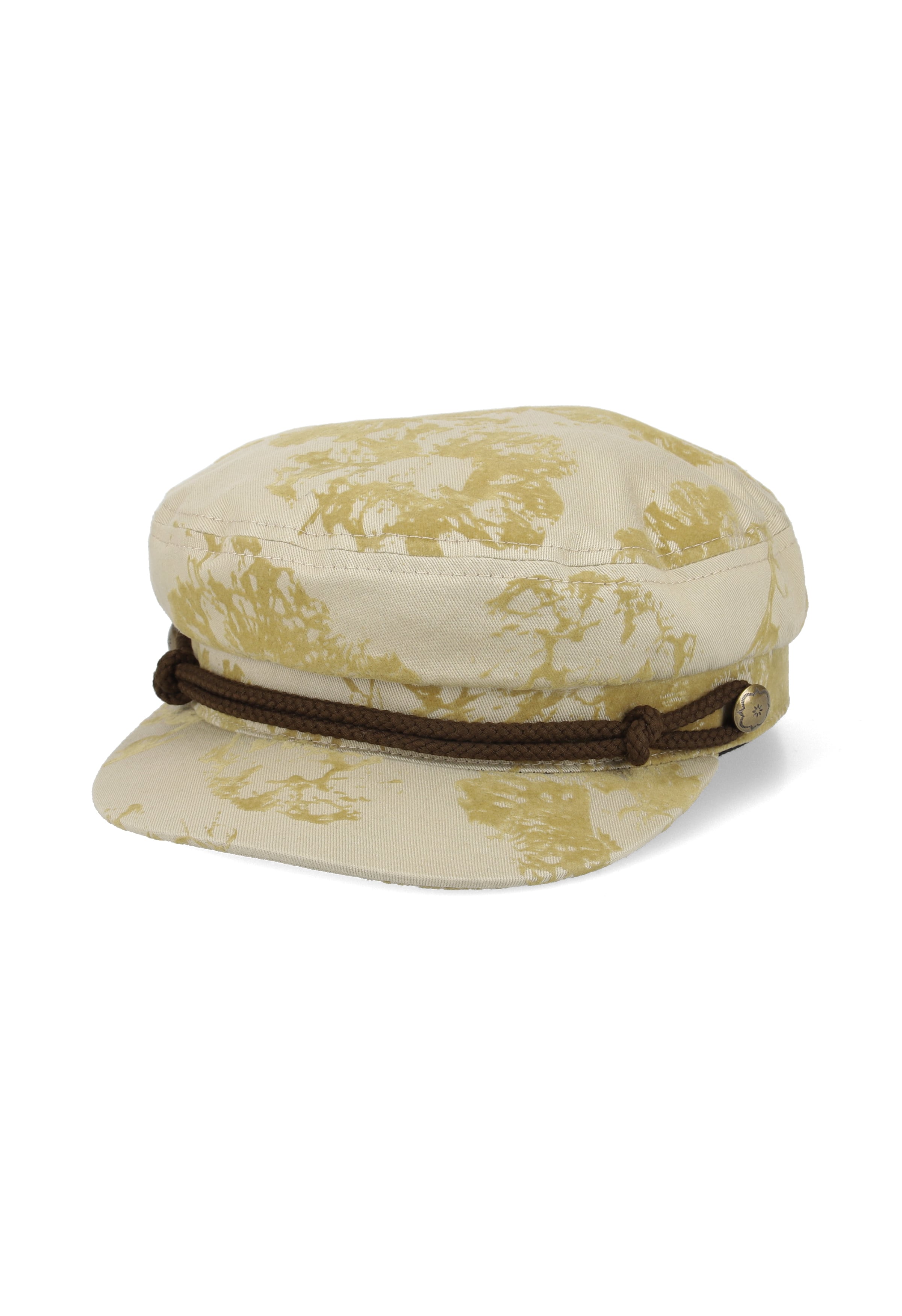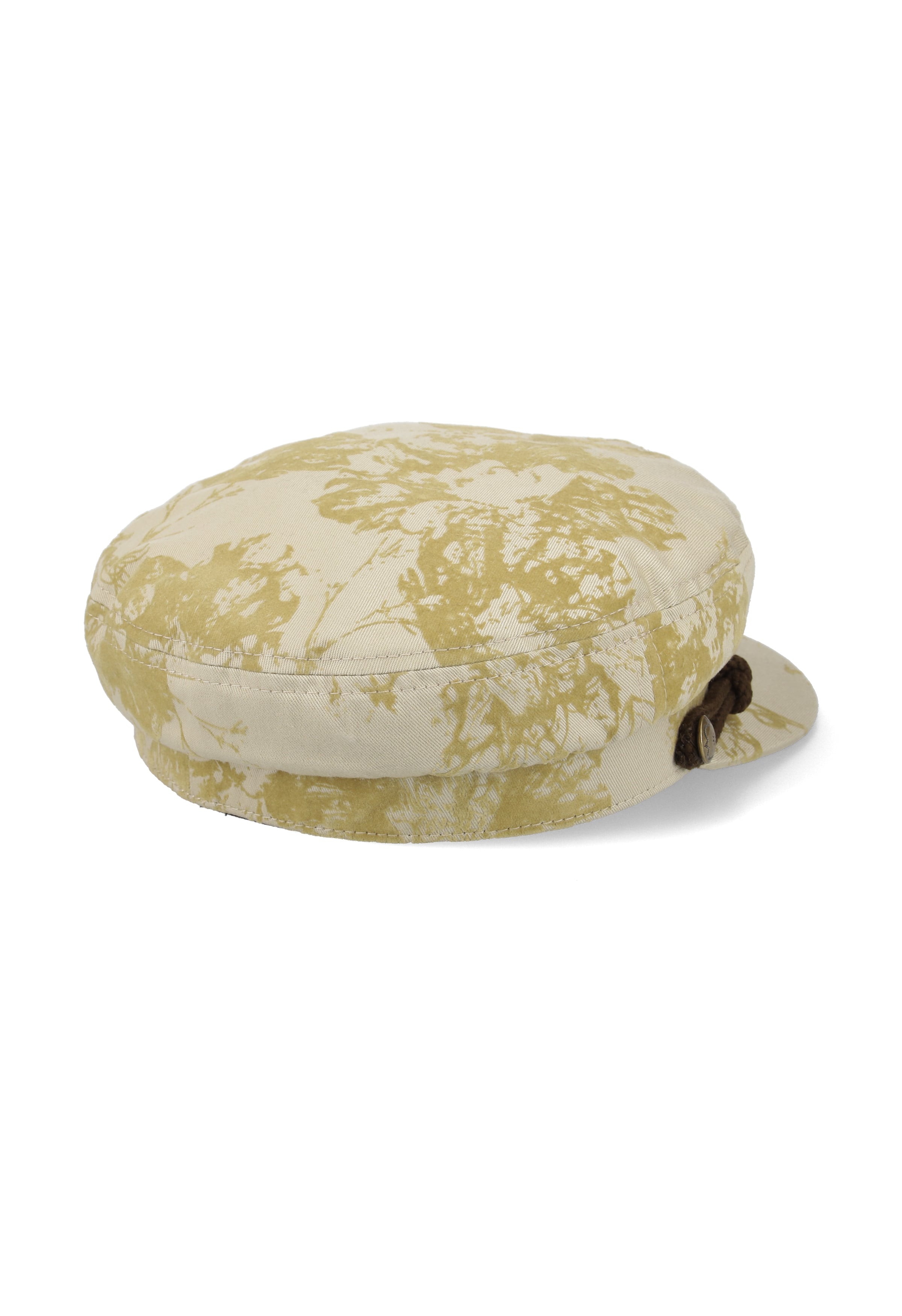チノクロスに全面フロッキープリント。架空のオリジナルフラワー「ICIRIA(イチリア)」を表現。短めのバイザーに深めの帽体、フロントの装飾が特徴的なフィッシャーマンキャップ。コンチョを模したボタンがアクセント。