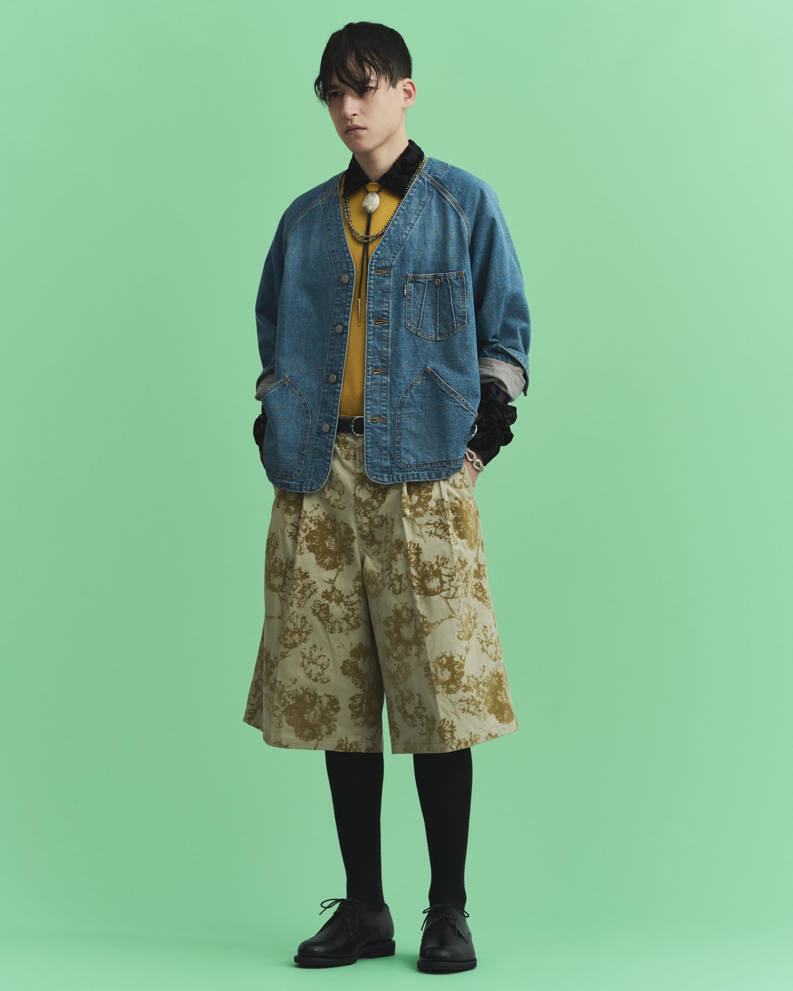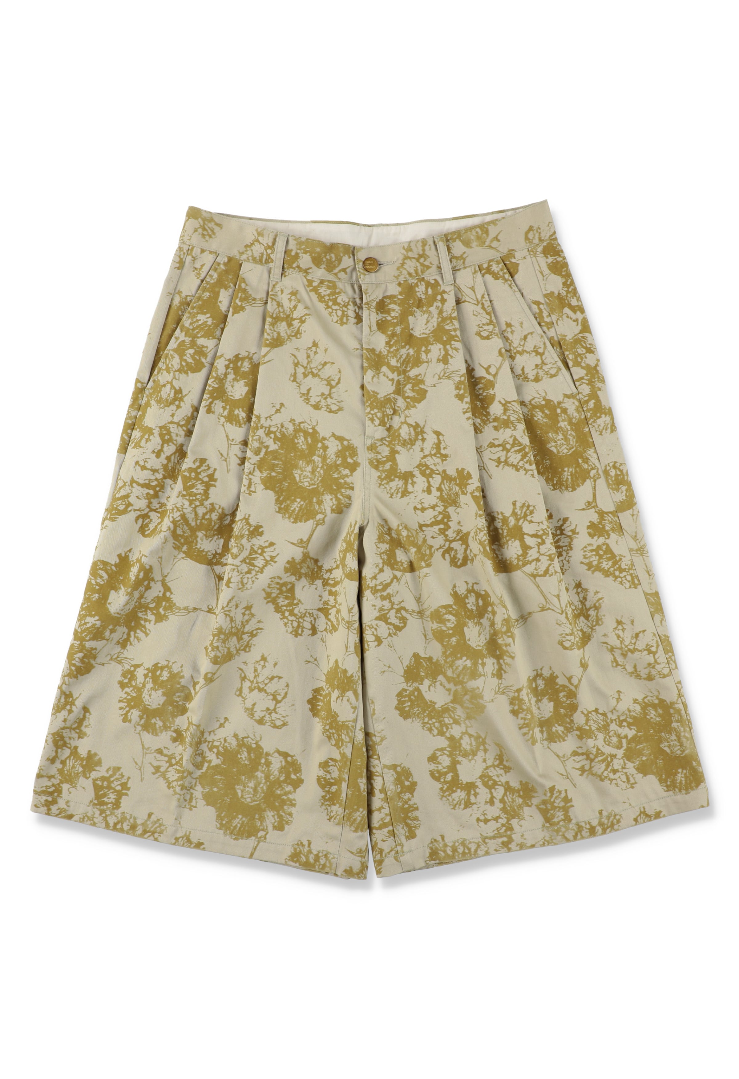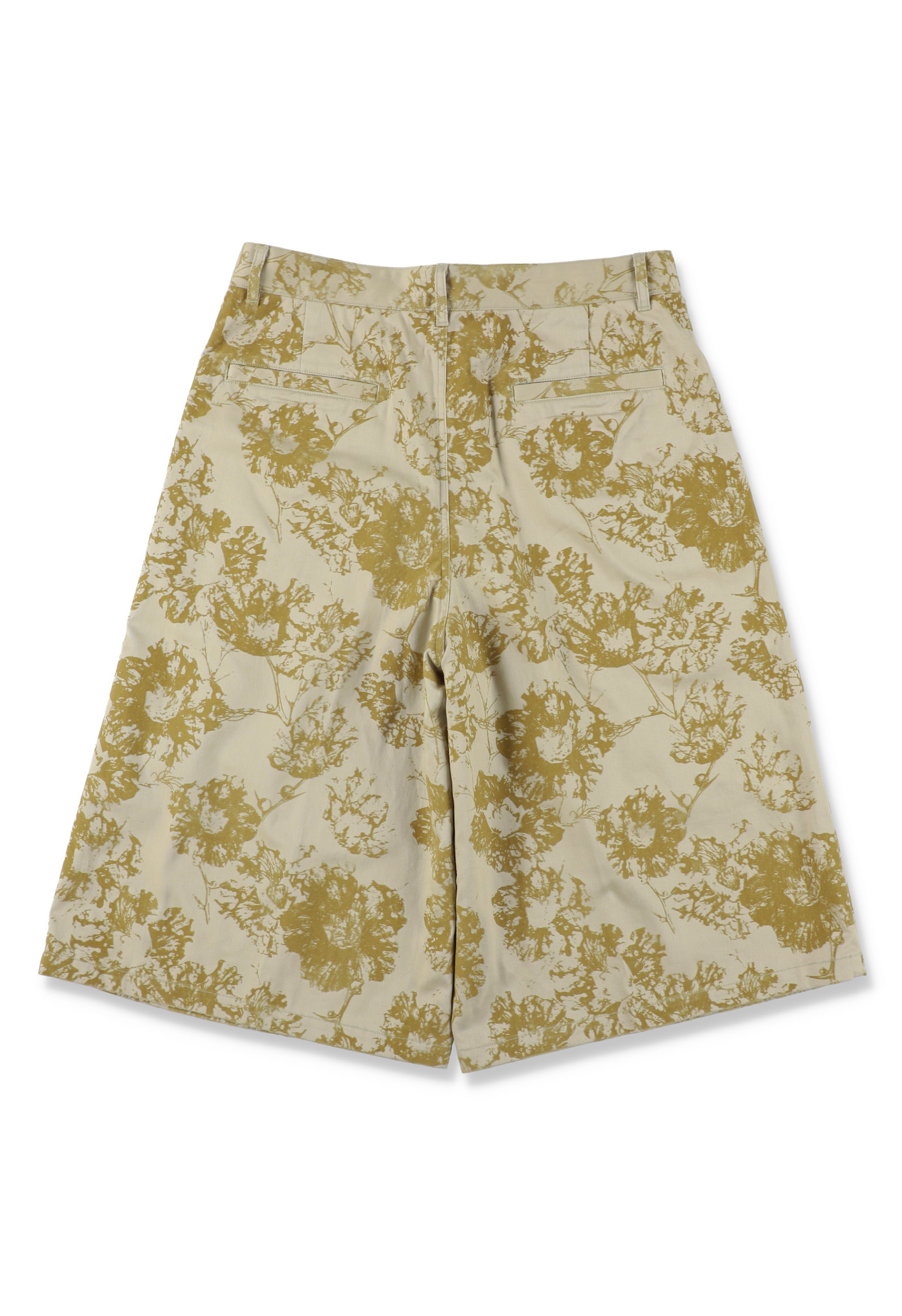 ワークアイテムとして定番のチノクロスに全面フロッキープリント。架空のオリジナルフラワー「ICIRIA(イチリア)」を表現。タックで身頃に分量を持たせ、広めの裾巾設計のワイドショーツ。深めの股上と膝下丈のロングレングス。