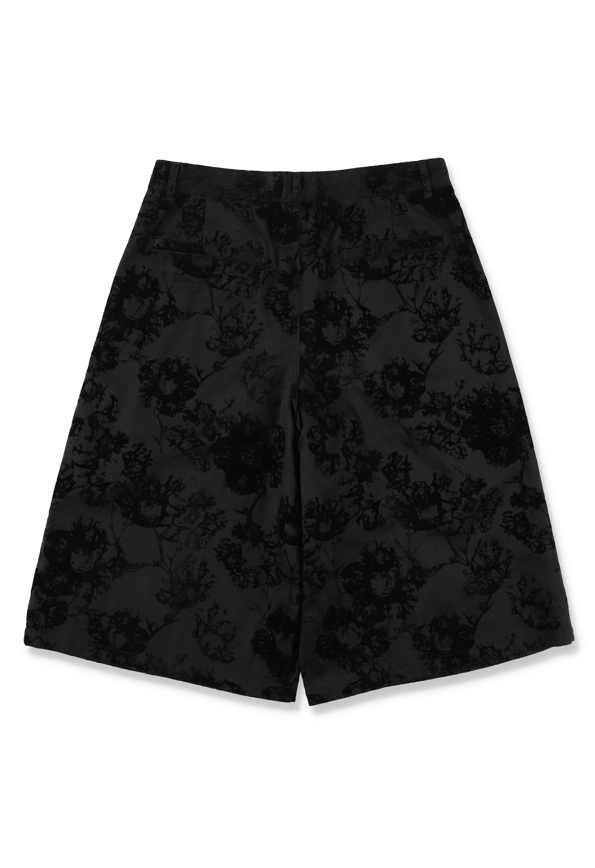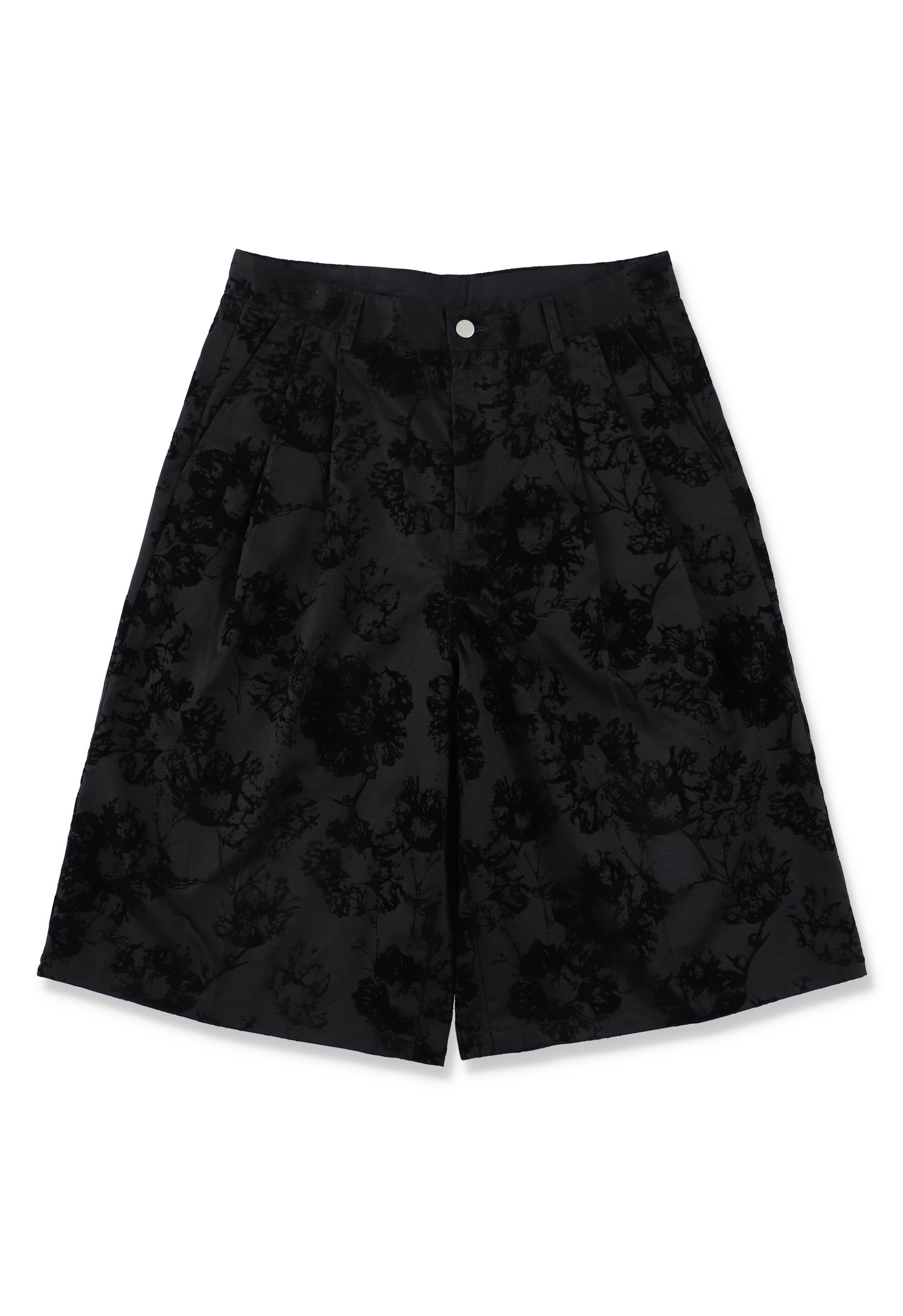 ワークアイテムとして定番のチノクロスに全面フロッキープリント。架空のオリジナルフラワー「ICIRIA(イチリア)」を表現。タックで身頃に分量を持たせ、広めの裾巾設計のワイドショーツ。深めの股上と膝下丈のロングレングス。