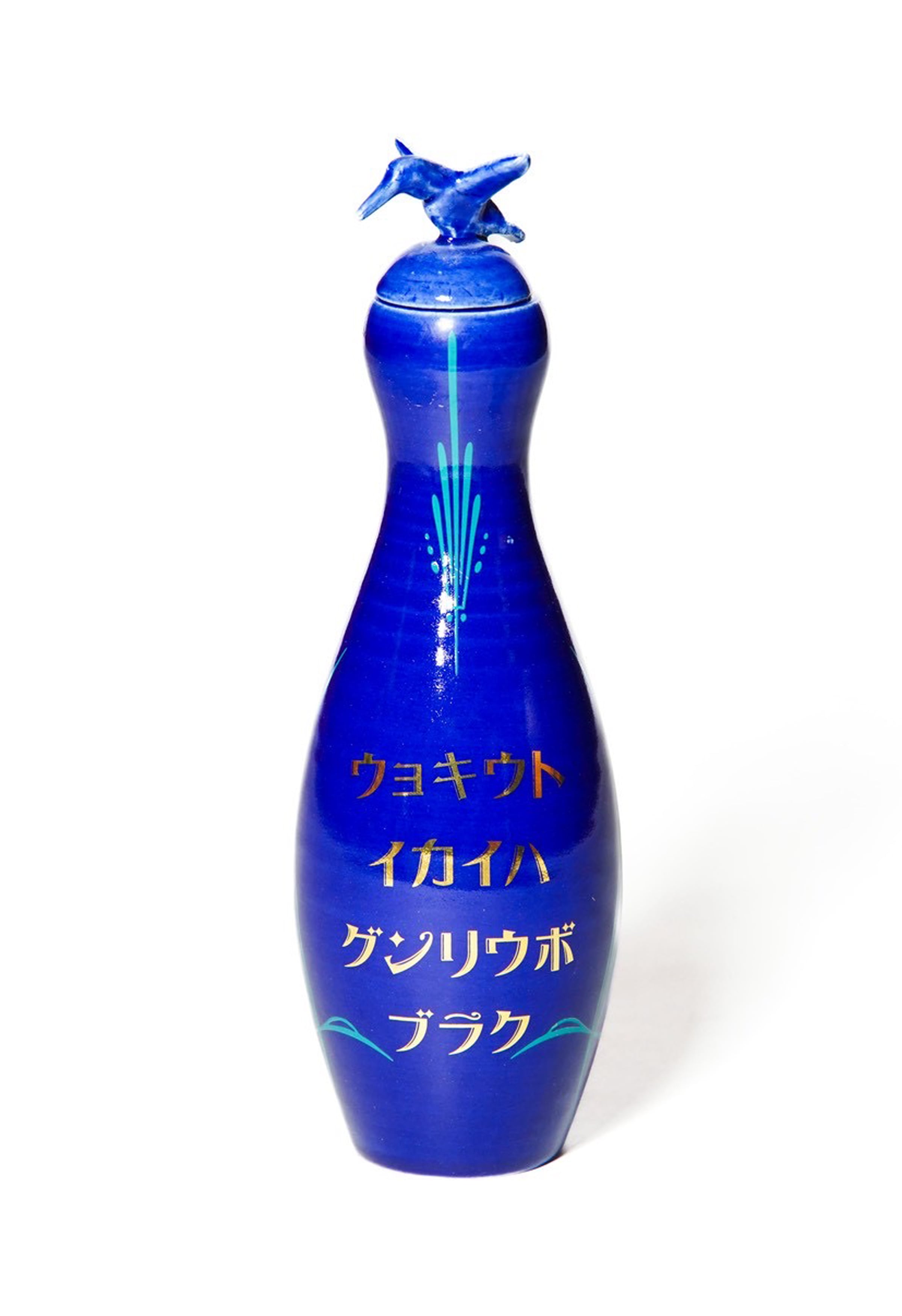 美濃焼の産地で採れた陶土を使用し、一つ一つ手作業で形成。釉薬でベースカラーを着色した後、金転写でレタリングをプリント。ボウリングピンとピンストライプ、50年代のアメリカンカルチャーを日本の技術、風習とミックスしたフラワーベース。