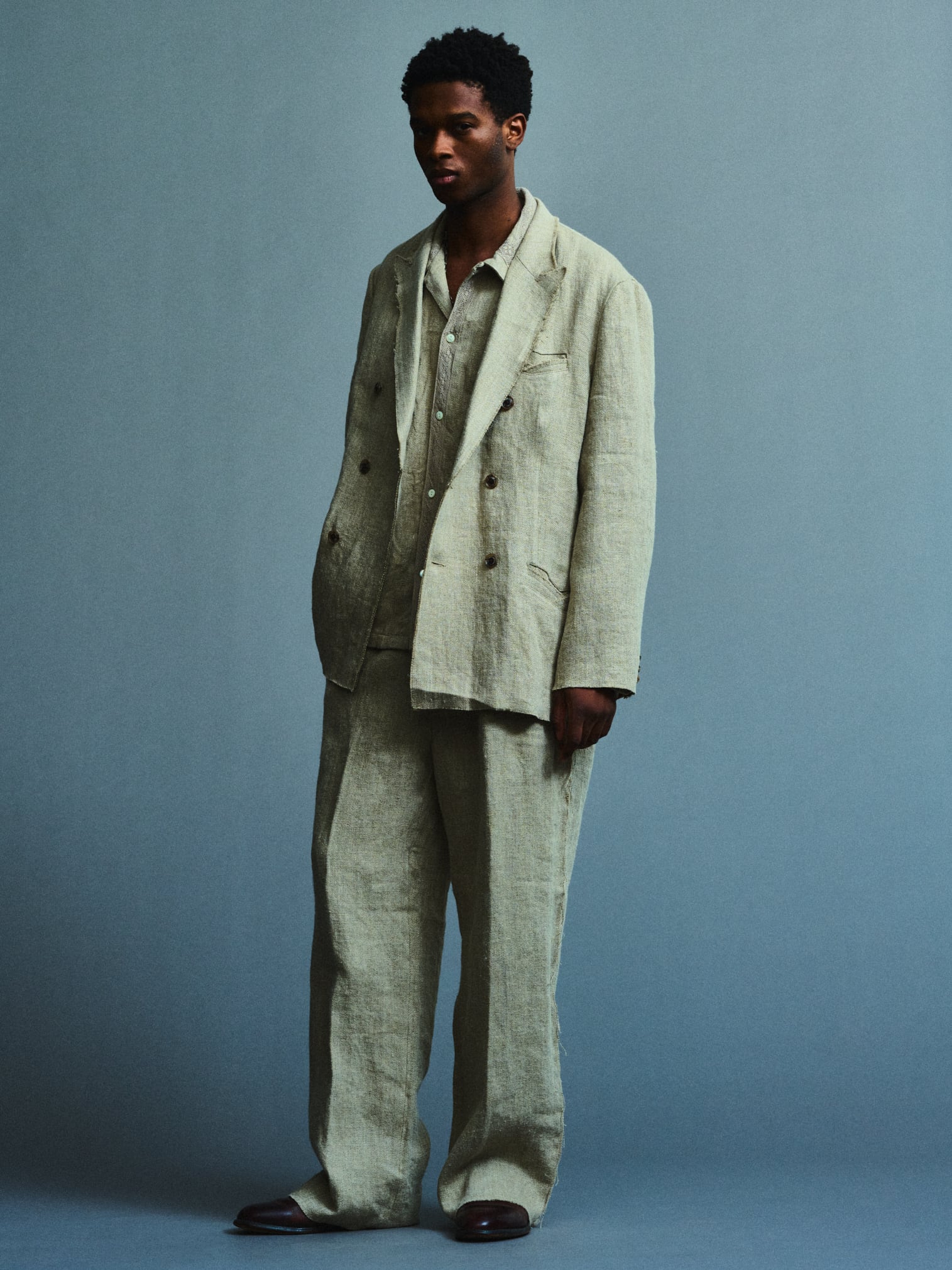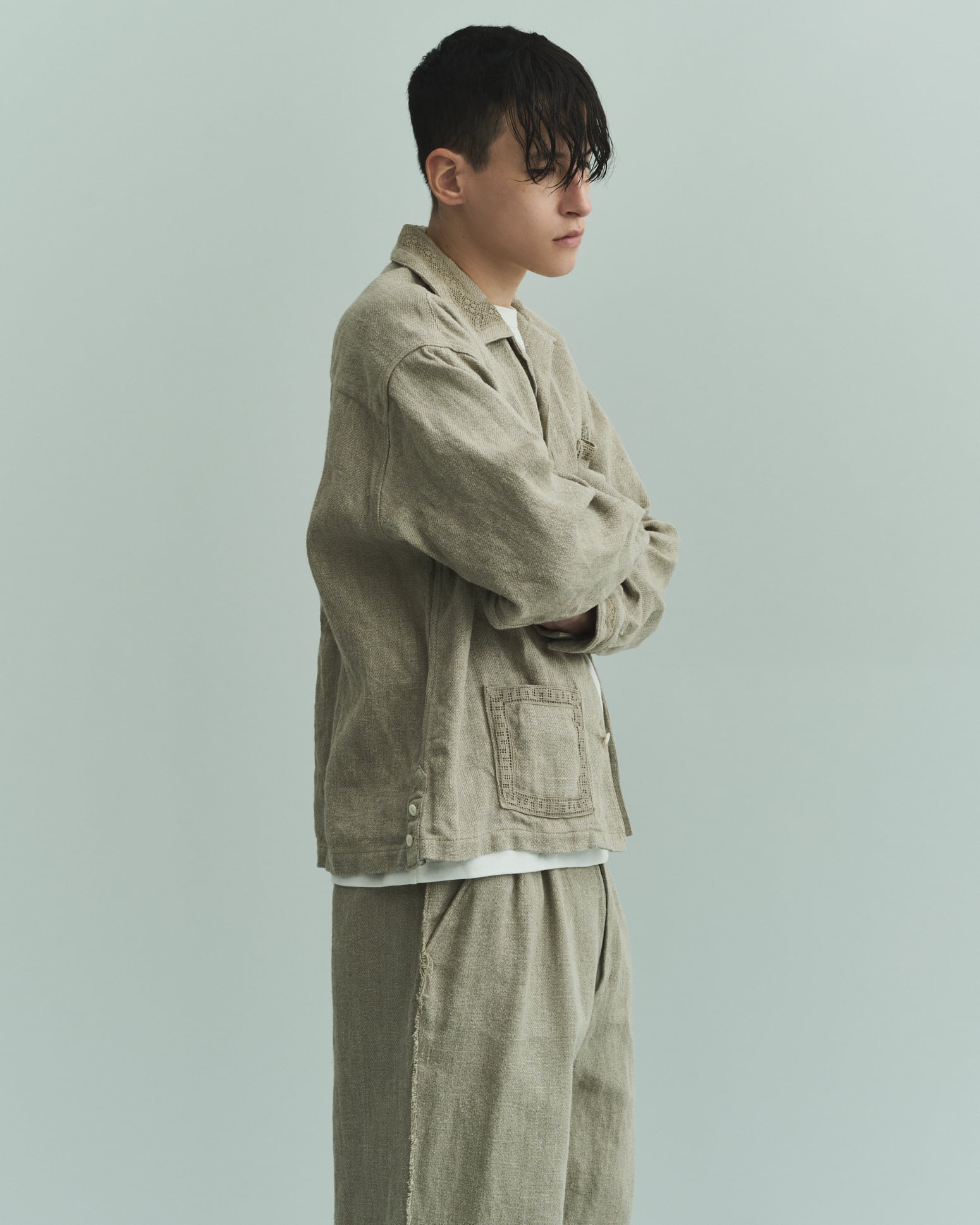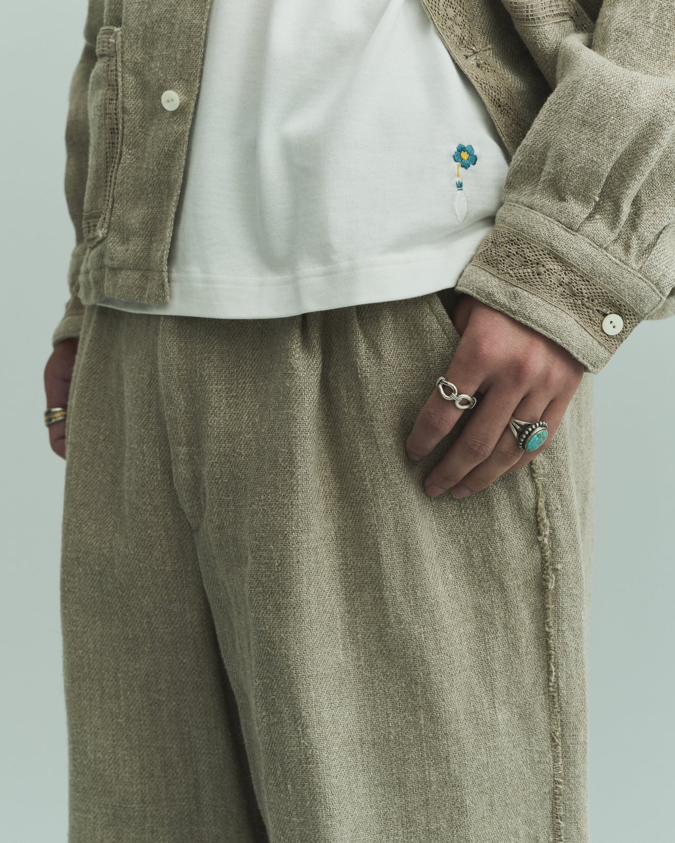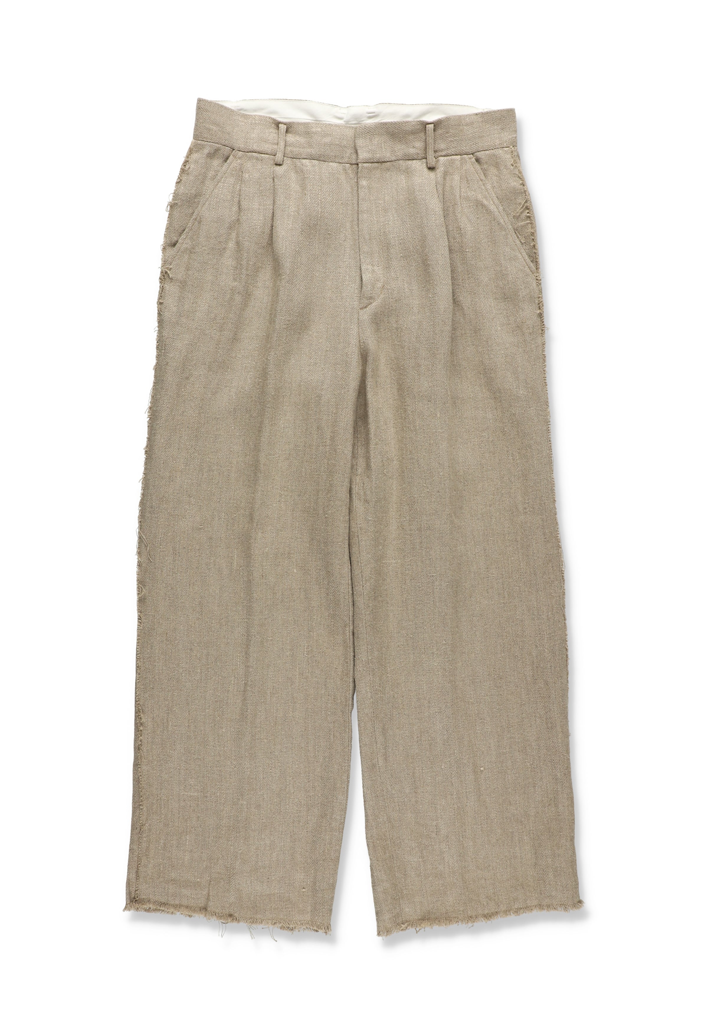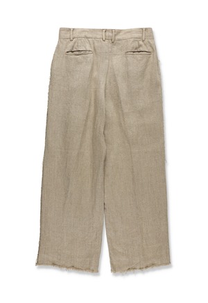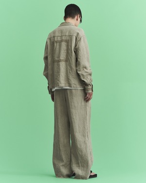 8番手の太いリネン糸を綾織りで超重厚に仕上げた、リネン100%ツイル。リネンの持つ本来の粗野感を残しつつも、セミウェットな質感と柔らかさを表現。部分的に断ち切りで仕上げたスラックスは、2タックを用いたややボリュームのあるシルエット。腰裏にはオリジナルマーベルトを採用。