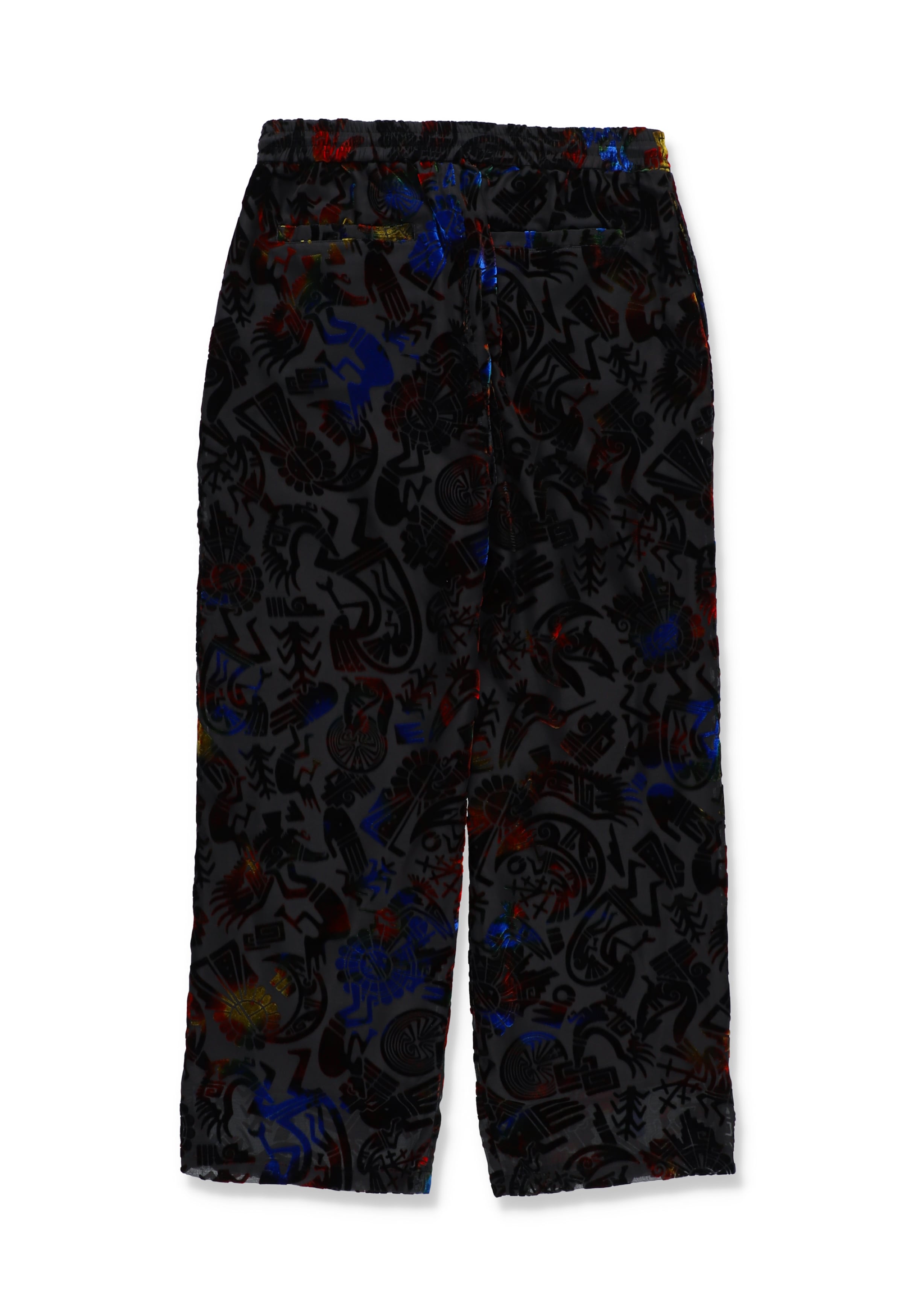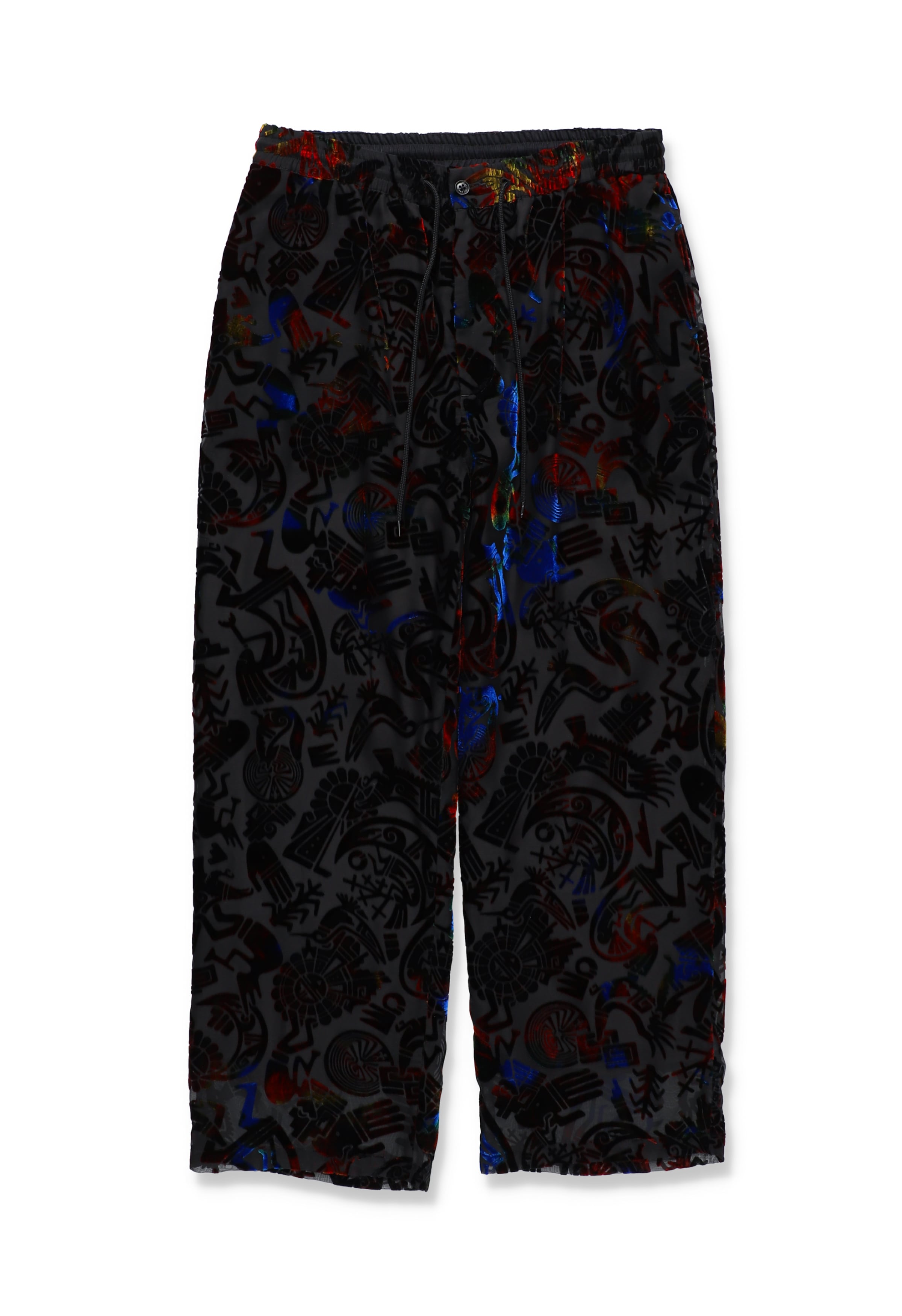 ネイティブアメリカンの中でも「ホピ族」が扱うことの多いモチーフを総柄で表現した、オリジナルファブリック。染色(地染め)後、トップのパイル部分にマーブル柄のプリントを施し、オパール加工でパイルを溶かして柄を表現。光沢の美しいレーヨンベルベットシリーズは、見る角度によって異なる美しいグラデーションが最大の特徴。定番のレギュラーシルエットのイージーパンツ。透け防止の裏地は肌触りが良く、ドライな着用感の綿レーヨン裏地を採用。ウエストドローコード、前開き仕様。