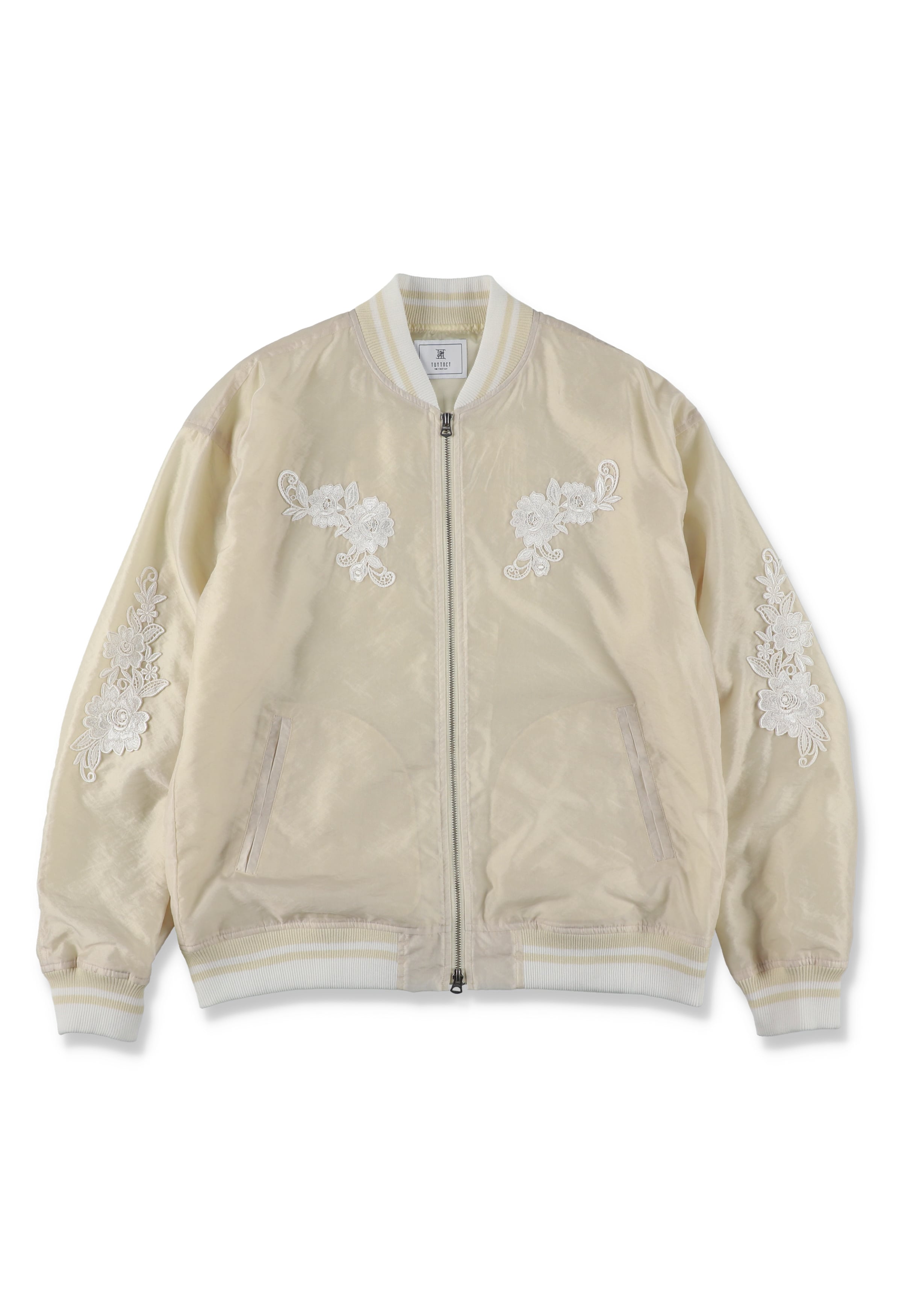 透け感と光沢が特徴のナイロンオーガンジーにスカジャンをイメージしてレースパッチを配置。ドレスのような素材感と膨らみ、そこに対象的なスカルモチーフが鎮座。
