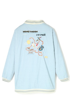 パイル部分に綿レーヨンの混紡糸、縦糸にCSY(コア・スパン・ヤーン / ポリウレタンの芯を含んだ糸)を使用することで、非常に柔らかい風合いが魅力のサマーコーデュロイ。トップのパイルとグランド部分を染め分け、シャンブレーのような表現によって、色目に深みを持たせています。襟ぐりから前端部分に使用したリブが独特な表情を見せる、ロングカーディガンです。背面にはレコード盤を模した、島内の様子を刺繍表現。
