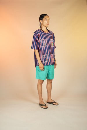洗濯して水を通すことで、生地の目が詰まり、耐久性の向上や身体への馴染みが生まれていきます。ガテマラシャツをデザインソースに、本来ケツァールが表現されるポケットの絵柄をハミングバードに置き換え、凹凸のある発泡プリントで表現しています。