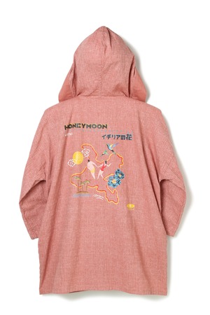 和服や風呂敷等に用いられることが多い、ドビー織りのコットンファブリックを採用。ドビー織りは通常の平織りと異なり、縦糸と横糸の織り方を変え、柄を表現しています。その為、生地に十字が生まれ、サザンクロス(南十字星)と呼ばれています。“和”の風合いを感じる生地を日本の文化である「法被」に落とし込みました。フードを取り付け、洗いざらしの表情を残すことで、海から上がったカップルたちがバサッと羽織る。そんな風景をイメージして、ビーチフーディと法被を合体させた一枚。