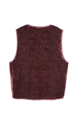 国産の上質なレーヨンベルベットを中綿、裏地とキルティングした、オリジナルファブリック。スリット糸と呼ばれる特殊な糸を織り込んでおり、扁平状のスリット糸は光を多く反射し、キラキラとした表情に。縁取られたパイピングや、身頃からはみ出すティア(涙)型のポケットが特徴的な中綿キルティングベスト。