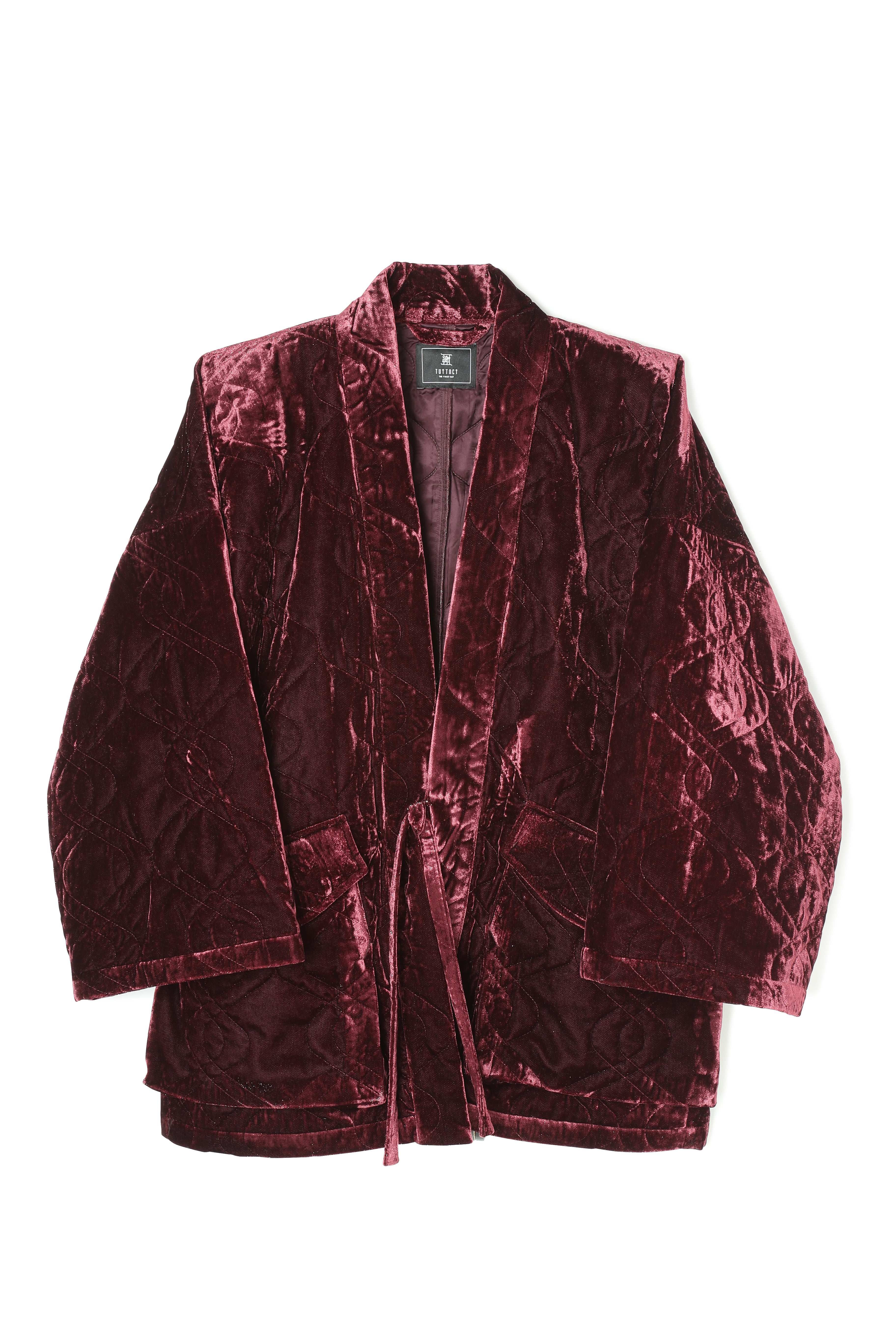国産の上質なレーヨンベルベットを中綿、裏地とキルティングした、オリジナルファブリック。スリット糸と呼ばれる特殊な糸を織り込んでおり、扁平状のスリット糸は光を多く反射し、キラキラとした表情に。その上品な素材を「半纏」という古き良き“和”のアイテムに落とし込んでいます。アウトレイヤーとして上からバサッと羽織って頂きたい一着。