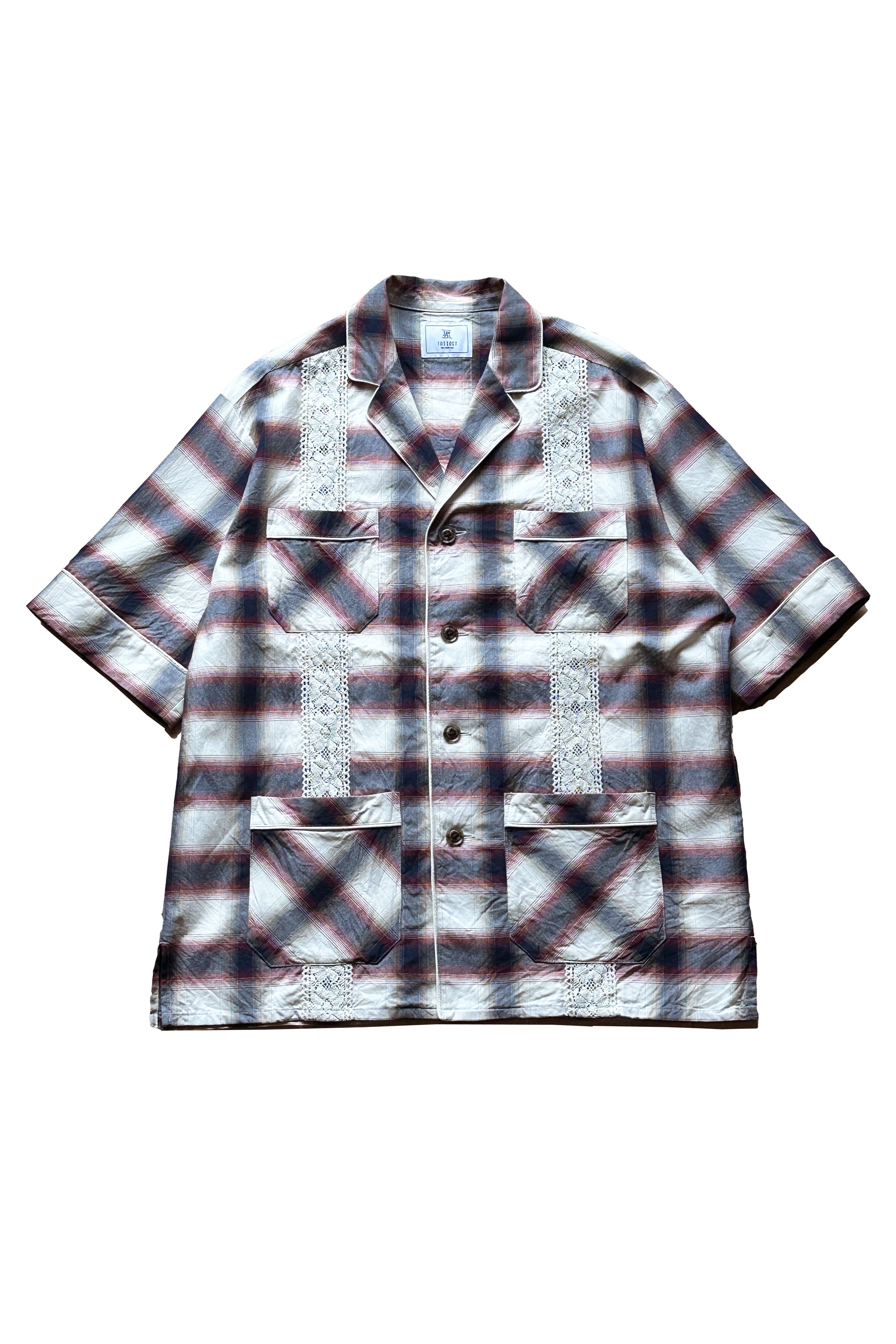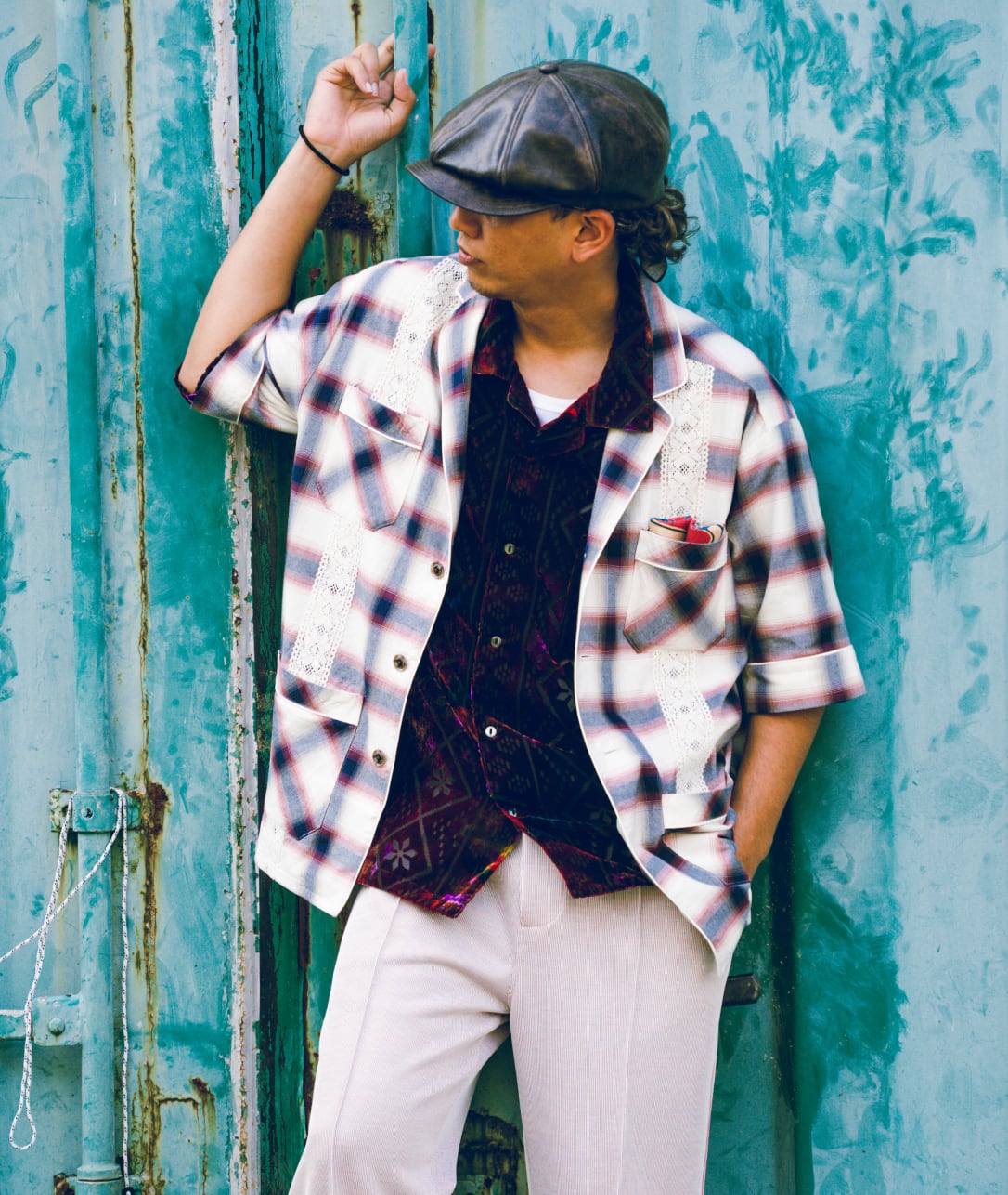 随所のパイピング、丸みを帯びた襟など、スリーピングシャツをベースにキューバシャツのディテールをミックス。キューバシャツに多く見られる、ピンタックや刺繍表現ではなく、デザインレースを配置。カバーオールのようなゆとりのあるシルエット。