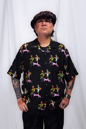 風俗街をテーマにしたアロハシャツ。旗艦店の所在地である那覇市「辻」、漢字では道と道が交差する意味を持つ「辻」の一文字を表現したグラフィック。中国文化の花文字を沖縄はW-OKI TATTOO Kenta氏によって、アメリカントラディショナルにアレンジ。夏らしいサラッとした肌触りとドレープが特徴のレーヨン生地にプリントを施しています。